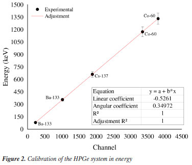 It also has two fixed bases that provide stability and mobility for the floors; four side walls (6), with fifty-six diffusers inserted at the lower edge on the front and back walls (7), arranged in two lateral and parallel rows, with twenty-eight each, made up of a square geometry of 1.0 cm per side, forming what is called air deflectors, each 60 cm long and 1.4 cm wide, designed to direct the flow of radioactive gas produced by the NORM sample (8) into the chamber. Characterization of the NORM sample For the characterization of the radionuclides present in the NORM sample inserted in the CamInd α-Rn, energy calibration of the gamma spectrometer, which model is shown in Figure 2, was performed. The model obtained from Equation 3 was used to characterize the radionuclides. The experimental design shows excellent correlation for mapping the photon energies (E) in the channels configured for the MCA (C). ![]()
