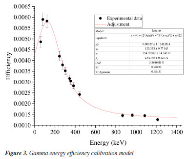 A mathematical model was empirically determined to calculate the efficiencies per energy to quantify the radionuclides present in the NORM sample, as demonstrated in the function shown in Figure 3. The Lorentz function best represented the behavior of the results obtained.
