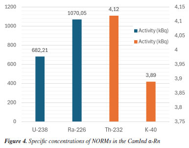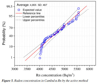 Radiometric scanning is essential for characterizing the sample used in the simulator, which is useful for studies involving exposure to natural radionuclides. The results allow the sample to be described as coming from a location with high levels of natural radioactivity, using the global averages presented by UNSCEAR2 as a comparative basis. Monitoring of 222Rn in CamInd α-Rn Figure 5 presents the measurements of Rn concentrations using the active AlphaGUARD detector. The data is correlated with the probability of a normal function occurrence, with a 95% confidence level. The average deviation for the radon concentration was 4,654 ± 467 Bq m-3. Before adding the NORM sample, the simulated background of the environment was estimated at 68 ± 25 Bq m-3. For the dataset presented in the experiment of Figure 5, the coefficient of variation was calculated at 10%, allowing for the observation of a low probability of dispersion and a high representation of the average value for the dataset of the experiment. The test of means confirms that the dataset adheres to a normal distribution, with median and mode values of 4,604 and 4,188 Bq m-3, respectively.