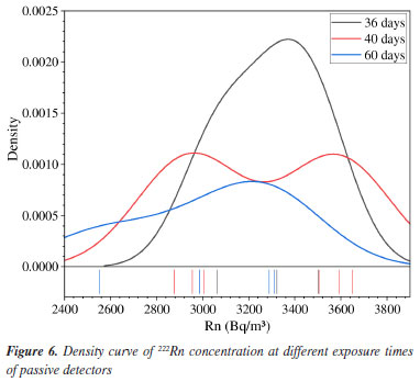 Passive monitoring with α Espec-222 allowed for determining an average concentration inside the simulator of 3,200 ± 324 Bq m-3, for n = 13, with a range from approximately 2,553 to 3,650 Bq m-3 and a coefficient of variation of 10%, corroborating the dispersion obtained in the experiment with the active detector. Table 1 presents the results from each device inside the CamInd α-Rn. From the measured values, the averages of concentrations at three different heights within the chamber were calculated: from 0 to 14.0 cm, 3,385 ± 280; from 17.0 to 31.5 cm, 3,199 ± 215; and from 34.5 to 52.0 cm, 2,831 ± 242 Bq m-3. This relationship aids in understanding the dispersion of radon within the physical simulator. At the monitoring point with a height between 34.5 and 52.0 cm, the gas concentrations were slightly lower, a fact justified by the greater distance from the base of the simulator, where the NORM material is contained, due to the density of Rn, as well as the presence of air diffusers on the ceiling of the CamInd α-Rn. Between the heights of 0 to 14.0 cm and 17.0 to 31.5 cm, as expected, the highest concentrations of 222Rn were evidenced due to the proximity of the devices to the NORM material. The study of the indoor distribution of 222Rn for concentration measurements with passive detectors over exposure times of 36, 40, and 60 days is presented in the density curve graph of Figure 6. The average concentration estimate for the 36 days was 3,325 ± 265 Bq m-3, with a variation coefficient of 8%. For the 40 days, the average was 3,248 ± 151 Bq m-3, with a variation coefficient of 10%. In 60 days of exposure, the average was 3,034 ± 353 Bq m-3 and the variation coefficient of 12%, whose predictability can be observed in the relationship presented in Figure 6.