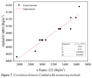 Considering the influence of time in determining the Rn concentration by the passive method, the weighted average and deviation based on the results obtained for the different measurement times were estimated. The weighted average and deviation were approximately 3,174 ± 270 Bq m-3, with a variation coefficient close to 8.5%, whose representativeness aligns with the variation coefficient obtained for the 36-day period, which is already a significant time in monitoring environments with high levels of natural radioactivity, as in the case of the study. The data obtained by the passive and active detectors were correlated to compare the empirical results. Figure 7 presents details of this correlation.