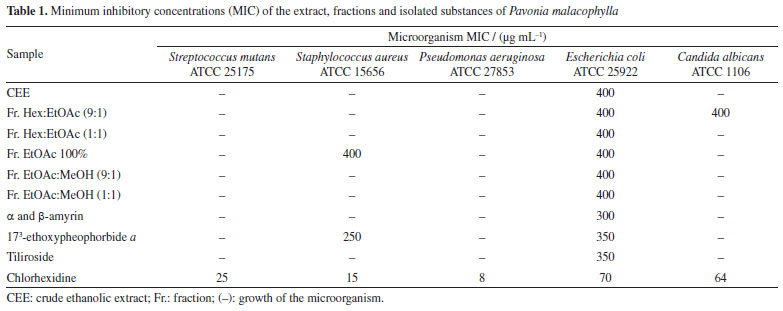 CONCLUSIONS The phytochemical studies with aerial parts of Pavonia malacophylla resulted in isolation and identification of 18 compounds, including one alcohol, three steroids, three triterpenes, four chlorophyll derivatives, six flavonoids and one phenolic acid. The crude ethanolic extract, fractions, and four isolated compounds (α and β-amyrin, 173-ethoxypheophorbide a and tiliroside) were analyzed against the Escherichia coli,Candida albicans, and Staphylococcus aureus strains, showing activity in concentrations ranging from 250 to 400 µg mL-1, thus providing an antimicrobial alternative in controlling infections. These results contributing to the chemotaxonomic and ethnopharmacological knowledge of the Malvaceae sensu lato family.