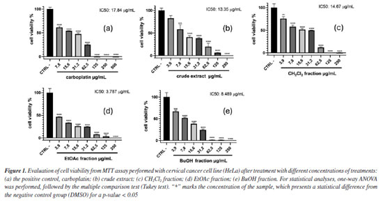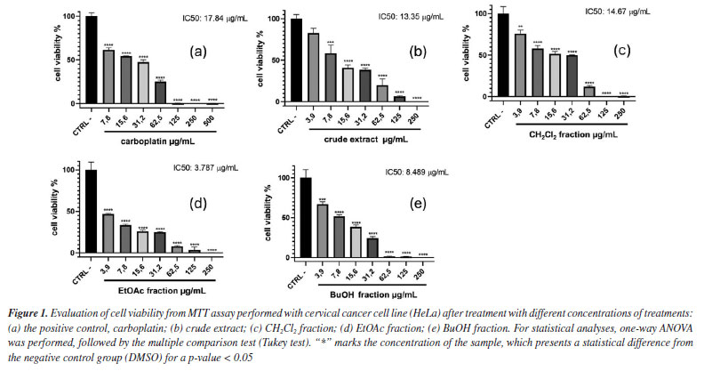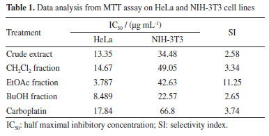 RESULTS AND DISCUSSION The antiproliferative potential of the crude extract, CH2Cl2, EtOAc, and BuOH fractions from T. hystrix root bark was evaluated against human cervical cancer (HeLa cell line) and non-cancerous cell lines (fibroblast cell line, NIH-3T3) through the MTT assay. According to Indrayanto et al.,19 all samples were considered to present good activity, being more cytotoxic to cancerous cells than non-cancerous. In particular, ethyl acetate fraction was considered the most promising, since half maximal inhibitory concentration (IC50) value of 3.787 µg mL-1 was observed to HeLa cells, which was lower than observed for the positive control, carboplatin (IC50 = 17.84 µg mL-1). According to the National Cancer Institute (NCI) guidelines, extracts with IC50 values below 20 µg mL-1 are considered promising for potential anticancer activity.20 In addition, the selectivity index (SI) found for all samples (values ≥ 2) indicates that the samples affect the cancer cells more than normal cells. This analysis also emphasizes the potential of the ethyl acetate fraction (SI = 11.25) as a prospective anticancer sample, since it showed a SI value ≥ 10.19 The percentage of viable HeLa cells for each sample when treated with different concentrations of treatments are shown in Figure 1, while the IC50 values for HeLa and NIH-3T3 cell lines, and the SI are presented in Table 1.