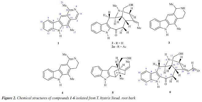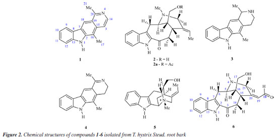 EXPERIMENTAL General experimental procedures Nuclear magnetic resonance (NMR) spectra were recorded on a Bruker ASCEND 500 spectrometer (500 MHz for 1H and 125 MHz for 13C), using CDCl3 as solvent. High-resolution mass spectrometry (HRESIMS) data were acquired using an micrOTOFQ II BrukerDaltonics mass spectrometer, with the use of the positive ion mode of analysis. Isolation and purification of the chemical compounds were conducted using several chromatographic methods, including column chromatography (CC), thin-layer chromatography (TLC), vacuum liquid chromatography (VLC), and high-performance liquid chromatography (HPLC). Medium pressure analyses were carried out using a medium pressure liquid chromatography (MPLC) system (Büchi, Flawil) equipped with a C-620 control unit, C-605 module pump, C-640 ultraviolet (UV) detector, and C-660 fraction collector. Analytical and semi-preparative chromatographic analyses were performed using an HPLC system (Shimadzu) equipped with a CBM-20A control unit, LC-20AD binary solvent pump, manual injector, and SPD-M20A diode array detector. A semi-preparative reversed phase (RP) C18 column (Kromasil 100A; 10 mm × 250 mm × 5 µm) was used. Column chromatography was performed on silica gel (0.063-0.200 mm, Merck). All solvents used for extraction and isolation were purchased from Synth with analytical grade. Plant material Root bark was collected at the Sítio Xodó in Varre-Sai, Rio de Janeiro, Brazil (20º54'26.7"S, 41º53'05.4"W), by Antônio Sérgio Nascimento Moreira. The voucher specimen (HUENF 14592) can be found at the herbarium of the State University of the North Fluminense Darcy Ribeiro. The current work was registered in the National System of Management of Genetic Heritage and Associated Traditional Knowledge (SisGen) under No. AC8E4F3. Extraction and isolation procedures Dried and powdered root bark (1.36 kg) from T. hystrix was extracted with MeOH three times at room temperature (each for 5 days), furnishing, after solvent evaporation, 80.3 g of root bark crude extracts. The crude extract was suspended in H2O and partitioned successively with dichloromethane (CH2Cl2), ethyl acetate (EtOAc), and butanol (n-BuOH). Once the EtOAc, and BuOH root bark extracts showed better results than CH2Cl2 in the antiproliferative potential assay, these extracts were selected to be chromatographed to isolation compounds. The EtOAc extract (6.45 g) was subjected to silica gel CC eluted with CH2Cl2:MeOH (100:1 to 1:1) yielding 8 fractions (THRA 1-THRA 8). Fraction THRA 7 (2.22 g) was applied to a neutral alumina CC and eluted with CH2Cl2:MeOH (100:0 to 1:1) to afford 10 subfractions (THRA 7.1-THRA 7.10). THRA 7.1 (46.6 mg) furnished a yellow precipitate, which was washed with acetone to give compound 1 (20.4 mg). THRA 7.3 (391.6 mg), shown to be purified, was identified as compound 2. THRA 7.10 (121.4 mg) was fractionated by a silica gel CC column with CH2Cl2:MeOH (100:0 to 1:1), yielding nine fractions (THRA 7.10.1-THRA 7.10.9). THRA 7.10.9 (19.7 mg) was purified by a silica gel CC column and eluted with CH2Cl2:MeOH (100:0 to 1:1) yielding the mixture (5.4 mg) of compounds 1, 3 and 4. THRA 8 (1.20 g) was fractioned by neutral alumina CC using CH2Cl2:MeOH (100:0 to 1:1) to afford 10 subfractions (THRA 8.1-THRA 8.10). THRA 8.7 (131.7 mg), shown to be purified, was identified as compound 5. Compound 1 (104.6 mg) was obtained as a precipitate from the BuOH fraction after washing with acetone. The BuOH extract (10.0 g) was applied to a neutral alumina CC and eluted with a CH2Cl2:MeOH (100:0 to 1:1) to afford 11 subfractions. After analytical analysis by high-performance liquid chromatography with diode array detector (HPLC-DAD), these fractions were grouped into 9 fractions (THRB 1-THRB 9). THRB 8 (100 mg) was chromatographed on MPLC using a C18 column (glass column 15/460-044032 manually packed with C18 as stationary phase) and the following gradient elution: solvent A = H2O and formic acid (0.1% v/v); solvent B = MeOH; elution profile = 0.0-70.0 min (5-100% B); 70.0130.0 min (100% B); flow rate of 15.0 mL min-1; 10 fractions were collected (THRB 8.1-THRB 8.10). Fraction correspondent to 6 (THRB 8.6, 18.0 mg) was identified as compound 3. The fraction 9 (THRB 8.9, 4.8 mg) was chromatographed on HPLC-DAD using a C18 column (Kromasil 100A; 10 mm × 250 mm × 5 µm) and the following gradient elution: solvent A = H2O and formic acid (0.1% v/v); solvent B = MeOH; elution profile = 0.0-25.0 min (35-90% B); 26.010.0 min (100% B); and flow rate of 3.0 mL min-1; allowing the isolation of compound 6 (retention time (tR) = 16.265 min, 3.4 mg). Compound characterization Olivacine (1) HRESIMS [M + H]+ m/z 247.1240 (100.0%; C17H15N2+, calcd. m/z 247.1235; Dm/z = 2.0), product ions = 232.0915 (90.0%), 205.0766 (20.0%), 191.0770 (15.0%), 167.0770 (5.0%); 1H NMR (500 MHz, CD3OD) d 8.87 (1H, s, H-18), 8.26 (1H, ddd, J 7.8, 1.1, 0.8 Hz, H-9), 8.10 (1H, d, J 6.6 Hz, H-3), 8.01 (1H, dl, J 6.6 Hz, H-14), 7.55 (1H, td, J 8.1, 1.1 Hz, H-11), 7.52 (1H, ddd, J 8.0, 1.3, 0.7 Hz, H-12), 7.30 (1H, ddd, J 8.1, 6.7, 1.4 Hz, H-10), 3.11 (3H-21, s), 2.80 (3H-17, s); 13C NMR (125 MHz, CD3OD) d 144.32 (C-2), 133.1 (C-3), 128.4 (C-7), 123.8 (C-8), 122.5 (C-9), 121.3 (C10), 129.7 (C-11), 112.2 (C-12), 144.34 (C-13), 118.1 (C-14), 134.6 (C-15), 113.3 (C-16), 12.4 (C-17), 117.5 (C-18), 122.4 (C-19), 159.1 (C-20), 20.4 (C-21). Affinine (2) HRESIMS [M + H]+ m/z 325.1914 (85.0%, C20H25N2O2+, calcd. m/z 325.1911, Dm/z = 0.9), product ions = 307.1709 (42.7%), 265.1706 (100.0%), 152.1082 (48.0%); 1H NMR (500 MHz, CD3OD) d 7.72 (1H, dl, J 8.1 Hz, H-9), 7.43 (1H, d, J 8.3 Hz, H-12), 7.31 (1H, ddd, J 8.3, 8.1, 0.9 Hz, H-11), 7.11 (1H, ddd, J 8.3, 8.1, 0.9 Hz, H-10), 5.54 (1H, ql, J 6.7 Hz, H-19), 3.58 (1H, m, H-21b), 3.483.42 (2H, m, 2H17), 3.40-3.34 (2H, m, 2H-6), 3.32-3.36 (1H, m, H-14b), 3.103.16 (1H, m, H-5), 3.04 (1H, ddd, J 1.5, 7.3, 11.4 Hz, H-15), 2.90 (1H, dl, J 10.8 Hz, H-21a), 2.51 (1H, dd, J 7