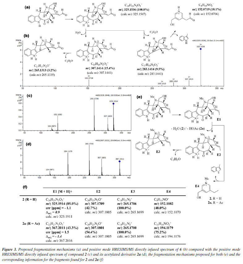 In the 1H NMR spectrum of compound 6, it was possible to observe the absence of the signal characteristic of hydrogen atoms of a methyl group linked to the aliphatic N-4, when compared with the 1H NMR spectrum of compound 2 [signal at dH 2.48 (s, 3H) with 1JHC HSQC correlation at dC 41.0 (Me-N-4)] or literature.17 In addition, when the compound has the Me-N-4 system, it is possible to observe structural effects affecting the chemical shift. In this case, due to the steric interactions, exemplified by the γ-effect, "the introduction of a methyl group into a cyclic molecule leads to new interactions with an adjacent hydrogen atom, resulting in the shielding of the carbon nuclei that are involved".26 In agreement with this, a difference in the signals of CH2-6 (dC 29.8 and dC 19.4, for compounds 6 and 2, respectively) and CH-16 (dC 42.6 and dC 40.0, for compounds 6 and 2, respectively) was observed in the APT-13C NMR spectra between compounds 6 and 2, where both carbon atoms in compound 2 presented shielded values of chemical shift due to the presence of Me-N-4, confirming the proposed structure of compound 6. A difference in the chemical shift of hydrogen can also be observed for H-6 and H-16 in the 1H NMR spectrum. Another difference in the 1H NMR spectrum of compound 6 compared to 2 was the absence of two signals characteristic of a monoterpene indole alkaloid structure,23 signals related to methine and methyl hydrogens, H-19 [dH 5.54 (1H, br q, J 6.7 Hz)] and 3H-18 [dH 1.68 (3H, dd, J 6.7, 1.9 Hz)], respectively, which can be observed in compound 2. On the other hand, based on the COSY, HMBC, and NOESY correlations (see correlations in Figure 4), two unshielded signals were assigned to H-18 [dH 8.85 (1H, br s)] and H-19 [dH 7.32 (1H, m)]. Furthermore, due to the 2JHC heteronuclear correlation in the HSQC spectrum dH 8.85 (H-18) and dC 188.4 (C18), and COSY correlations observed between H-18 and H-19, these signals are related to a α,β-unsaturated carbonyl group. The ketone group localized at position C-3 (dC 192.2) was confirmed by 2JHC heteronuclear correlation with H-14a [dH 2.51 (1H, dd, J 7.4, 13.0 Hz)] in the HMBC spectrum. A signal at dC 64.4 observed in the APT-13C NMR spectra, characteristic of a C-atom bonded to a hydroxyl group, correlated with two signals of diastereotopic hydrogens in the 1H NMR spectrum at dH 3.52 (1H, dd, J 11.1, 6.0 Hz, H-17a) and dH 3.60 (1H, dd, J 11.1, 5.0 Hz, H-17b), which were assigned to CH2-17, and indicates the presence of a methylene carbinol carbon. Although there were fewer correlations in the HMBC spectrum, information from the MS/MS analysis of the directly infused compounds 6, 2, and its acetylated derivative 2a supported this proposed structure. As shown in Figure 3, these three molecules exhibited a similar fragmentation pattern, confirming that they belong to the same type of monoterpene indole alkaloid structure, the corynanthean type (vobasan subtype).27 The product ion at m/z 307.1414 (C19H19N2O2+) for compound 6, m/z 307.1709 (C20H23N2O+) and m/z 307.1801 (C20H23N2O+) for compounds 2 and 2a, respectively, indicates the loss of H2O (-18 Da) for compounds 6 and 2, and HOAc (-60 Da) for 2a. Another product ion and suggested molecular formula that could provide key information about the chemical structure of compound 6 is the one at m/z 152.0719 (C8H10NO2+). For compounds 2 and 2a these were observed at m/z 152.1082 (C9H14NO+) and m/z 152.1082 (C11H16NO2+), respectively. The similarities and differences between these two alkaloids (6 and 2) are confirmed by these fragments, which aid in the suggestion of carbinol carbon at CH2-17 and carbonyl of the aldehyde group at CH-18. The relative stereochemistry for the C-16 was proposed according to the literature.23 Compound 2 and its epimer present different values for the chemical shift of C-16. The literature23,28-30 shows a dC ~ 38.5 for C-16 from epi-affinine.Herein, values of dC 40.0 and dC 42.6 were observed for C-16 in compounds 2 and 6, respectively, showing that these compounds have a different stereochemistry compared to the epimer. Compound 6 was named as Nb-demethyl-18-formyl-affinine. Figure 3 shows the HRESIMS/MS spectrum for compounds 6, 2, and 2a (Figures 3b, 3c, 3d, respectively), the proposed fragmentation mechanisms for both (Figures 3a and 3e, respectively), and the corresponding information for the fragments found for 2 and 2a (Figure 3f).