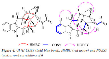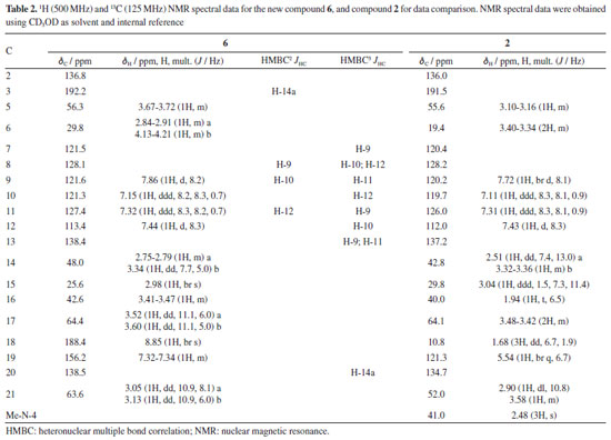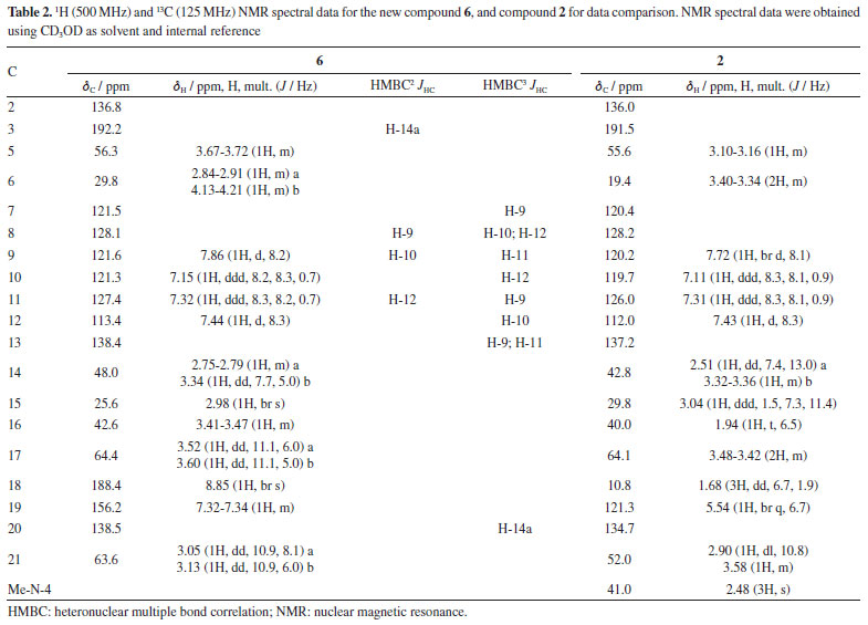 Analysis of the 1H, attached proton test (APT)-13C, and heteronuclear single quantum correlation (HSQC) NMR spectra indicated signals corresponding to 19 C-atoms, including 12 sp2 carbon atoms [six methines and six non hydrogenated: assigned as one indole ring - dC 136.8 (C-2), 121.5 (C-7), 128.1 (C-8), 121.6 (C9), 121.3 (C-10), 127.4 (C-11), 113.4 (C-12), and 138.4 (C-13), two carbonyl groups - dC 192.2 (C-3) and 188.4 (CH-18), and one double bond - dC 156.2 (C-19) and 138.5 (C-20)], 3 sp3 methines {CH-5, CH-15, and CH16 [including one linked to an N-atom at dC 56.3 (C-5)]}, and 4 sp3 methylenes {CH2-6, CH2-14, CH2-17 and CH2-21 [including one linked to an N-atom at dC 63.5 (CH2-21)]}. In the 1H NMR spectrum, it was possible to recognize the presence of four signals characteristic of aromatic hydrogen atoms of a non-substituted indole ring24 at dH 7.86 (1H, d, J 8.2 Hz, H-9), 7.15 (1H, ddd, J 8.3, 8.2, 0.7 Hz, H-10), 7.32 (1H, ddd, J 8.3, 8.2, 0.7 Hz, H-11), and 7.44 (1H, d, J 8.3 Hz, H-12), correlated in the HSQC spectrum with the carbon signals at dC 121.6 (CH-9), 121.3 (CH-10), 127.4 (CH-11), and 113.4 (CH-12), respectively. The 1H-1H-COSY spectrum of 6 was used to establish homonuclear hydrogen atom interactions (geminal and vicinal), and HSQC and HMBC (heteronuclear multiple bond correlation) experiments to recognize heteronuclear correlations through interactions between C- and H-atoms via direct (1JHC) and long-range couplings, involving two (2JHC) and three (3JHC) bonds. All NMR data are presented in Table 2, and Figure 4 summarizes the observed 1H-1H-COSY, HMBC, and 1H-1H-NOESY (nuclear Overhauser enhancement spectroscopy) correlations. These data contribute to confirming the presence of a non-substituted benzene ring in the indole moiety. Furthermore, a similarity between compounds 6 and 2 could be suggested. The principal difference between these two alkaloids lies in the absence of the methyl group linked to the aliphatic N-4 (or Nb), and the presence of carbonyl of aldehyde group (CH-18) in 6, replacing the methyl group (CH3-18) in 2. The 1H and 13C NMR chemical shift assignments for compound 2 are also presented in Table 2.