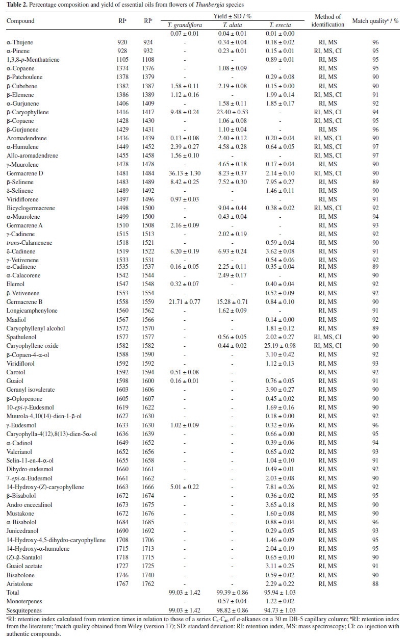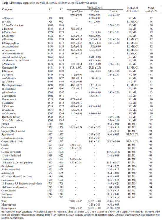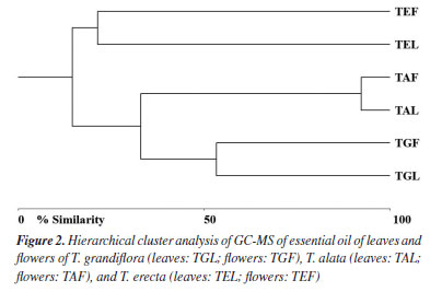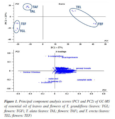 RESULTS AND DISCUSSION The steam distillation of the leaves and flowers furnished yellowish oils with citric aromas. The highest yield was obtained from the leaves and flowers of T. grandiflora (0.09 ± 0.01 / 0.07 ± 0.01%, respectively) (Tables 1 and 2).
