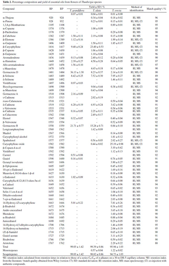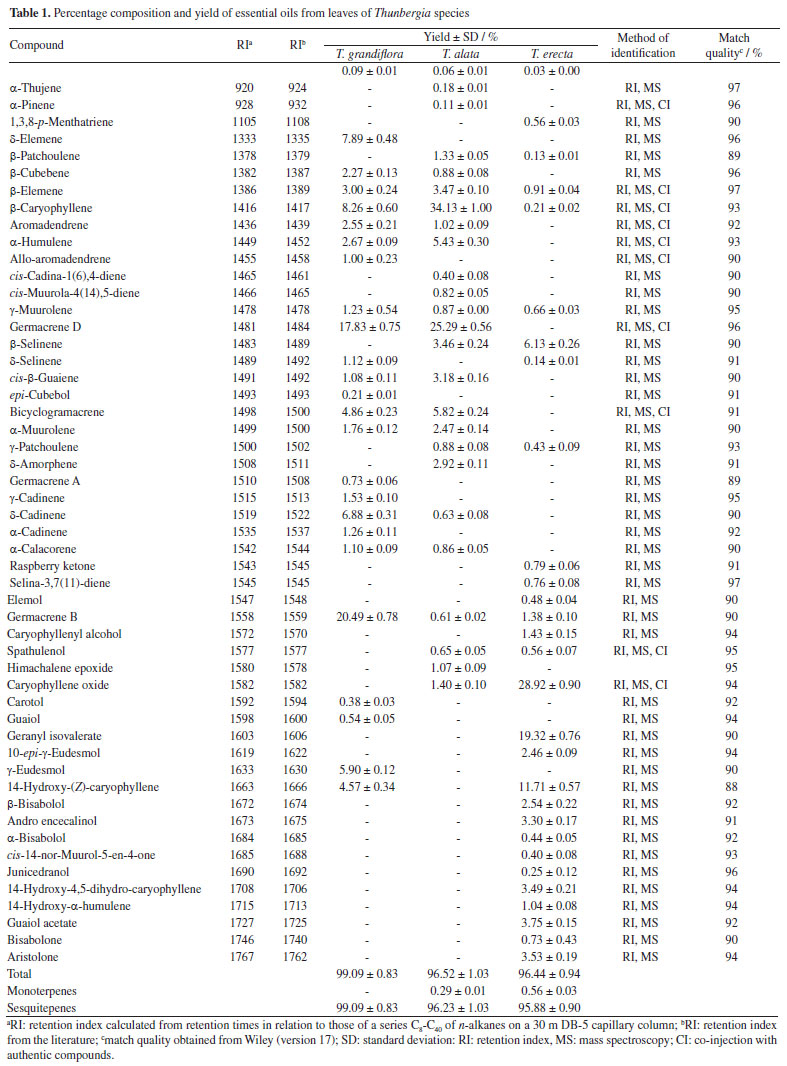 EXPERIMENTAL Plant material The fresh leaves and flowers of T. grandiflora, T. alata and T. erecta were collected from three adult plants of each species during the flowering period in the Federal Rural University of Pernambuco (UFRPE), in a fragment of Atlantic Forest, (8º01'05.2"S / 34º56'50.6''W) in the morning period in February 2019 (registered in National System for the Management of Genetic Heritage and Associated Traditional Knowledge (SisGen) under No. 335599). The plants were identified by botanist Dr. Maria R. C. S. de Melo (Federal Rural University of Pernambuco). Voucher of all samples were mounted and deposited in the Vasconcelos Sobrinho Herbarium of the UFRPE, under numbers: 54150 Thunbergia grandiflora Roxb., 54149 Thunbergia alata Bojer ex Sims. and 54154 Thunbergia erecta T. Anderson. Chemicals All monoterpene (α-pinene) and sesquiterpenes (β-elemene, β-caryophyllene, aromadendrene, α-humulene, allo-aromadendrene, germacrene D, bicyclogramacrene, spathulenol and caryophyllene oxide) used in the identifications of volatile components were purchased from Sigma-Aldrich. Instrumental analysis The essential oils from fresh leaves (100 g) and flowers (100 g) were separately isolated using a modified Clevenger-type apparatus and hydrodistillation for 2 h. The oil layers were separated and dried over anhydrous sodium sulfate, stored in hermetically sealed glass containers, and kept at low temperature (-5 ºC) until analysis. Total oil yields were expressed as percentages (g 100 g-1 of fresh plant material). All experiments were carried out in triplicate. Quantitative gas chromatography (GC) analyses were carried out using a PerkinElmer Clarus 500 GC apparatus equipped with a flame ionization detector (FID) and a non-polar DB-5 fused silica capillary column (30 m × 0.25 mm × 0.25 μm) (J & W Scientific). The oven temperature was programmed from 60 to 240 ºC at a rate of 3 ºC min-1. The injector and detector temperatures were 260 ºC. Hydrogen was used as the carrier gas at a flow rate of 1 mL min-1 in split mode (1:30). The injection volume was 1.0 µL of diluted solution (1/100) of oil in n-hexane. The amount of each compound was calculated from GC-FID peak areas in the order of DB-5 column elution and expressed as a relative percentage of the total area of the chromatograms. The qualitative gas chromatography-mass spectrometry (GC-MS) analyses were carried out using a Varian 220-MS IT GC system with a mass selective detector, mass spectrometer in EI 70 eV with a scan interval of 0.5 s and fragments from 40 to 550 Da. fitted with the same column and temperature program as that for the GC-FID experiments, with the following parameters: carrier gas = helium; flow rate = 1 mL min-1; split mode (1:30); injected volume = 1 µL of diluted solution (1/100) of oil in n-hexane. Identification of the components was based on GC-MS retention index with reference to a homologous series of C8-C40 n-alkanes calculated using the Van der Dool and Kratz equation22 and by computer matching against the mass spectral library of the GC-MS data system (NIST 11 and Wiley, version 17) and co-injection with authentic standards as well as other published mass spectra.23 Area percentages were obtained from the GC-FID response without the use of an internal standard or correction factors. Principal component analysis Principal component analysis (PCA) based on the complete data set (three different plant samples for each species) was conducted to evaluate the chemical variation of essential oils of leaves and flowers of T. grandiflora,T. alata and T. erecta. The GC-MS data were exported in ASCII format to Microsoft Excel (Microsoft Corporation, Redmond, WA, USA) to produce a data matrix of sample versus metabolite peak with associated peak areas. All the analyses were performed using Unscrambler® software, version 9.5.24 A similarity graph was generated by the distance of the correlation coefficient using hierarchical cluster analysis (HCA) with the aid of BioDiversity Pro, version 2.25 Acetylcholinesterase and butyrylcholinesterase activity The acetylcholinesterase (AChE) and butyrylcholinesterase (BuChE) inhibition tests were performed using the colorimetric method described by Ellman,26 with modifications. Solutions containing 50 μL of phosphate buffer 50 mM, pH 7.4, 125 μL of dithionitrobenzoic acid (DTNB, 3 mM in phosphate buffer, pH 7.4), 25 μL of the enzymes acetylcholinesterase (AChE from electric eel, 1 U mL-1 in phosphate buffer, pH 7.4) or butyrylcholinesterase (BuChE from equine serum, 1 U mL-1 in phosphate buffer, pH 7.4) and different concentrations (0.78-50 µg mL-1) of the essential oils from the leaves of T. grandiflora,T. alata,T. erecta and the positive control were diluted in MeOH and added to each well of a 96-well microplate, followed by incubation for 15 min at 25 ºC. Next, 25 μL of acetylthiocholine iodide (ACTI, 15 mM in phosphate buffer, pH 7.4) or 25 μL of butyrylcholine iodide (BTChI, 15 mM in phosphate buffer, pH 7.4) were added. AChE and BuChE activity were analyzed in an ELISA EZ Read 2000 microplate reader with absorbance at 405 nm every 13 s, five times. Donepezil was used as the positive control. All samples were analyzed in triplicate. After normalization of the data, the nonlinear regression curve was created with the aid of the GraphPad Prism, version 7.01 (GraphPad Software, San Diego, CA, USA) statistical program. Toxicity against Artemia salina Leach The brine shrimp lethality bioassay was performed following the reported procedure by Meyer et al.27 with modifications. The growth medium was prepared with filtered sea water in a small tank divided into two compartments. The shrimp eggs were added to the covered compartment and a lamp was placed above the open side of the tank to attract hatched shrimps through perforations in the partition wall. After 48 h, the shrimps mature as nauplii (A. salina) and were ready for the assay. Stock solutions of the