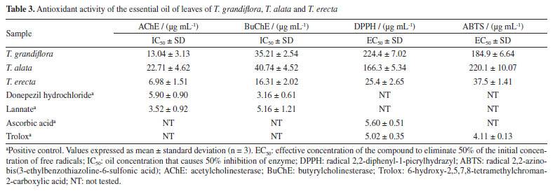 The toxicity test with Artemia salina revealed low mortality (< 10%) at the concentration of 1000 μg mL-1. Therefore, the mean lethal concentration was not estimated. Among the three oils tested, the greatest inhibitory effect was observed for T. erecta oil, with a more pronounced inhibition of the AChE enzyme compared to BuChE. Furthermore, in the tests with AChE, T. erecta oil demonstrated an inhibitory effect equivalent to that observed for the positive control donepezil hydrochloride. On the other hand, the positive control lannate presented an inhibitory effect approximately 2 and 3 times greater than T. erecta oil in the tests with AChE and BuChE, respectively. The methanolic extract of T. grandiflora leaves collected in Bangladesh is reported33 to have AChE and BuChE enzyme inhibition properties. However, the effectiveness in preventing AChE and BuChE enzymes observed for the ethanolic extracts were approximately 19 and 9 times less active than the essential oil of the plant reported in the present study. Another study34 reports that the aqueous extract of Thunbergia laurifolia leaves collected in Thailand revealed significant potential to inhibit AChE in mice exposed to lead in in vivo and in vitro models, indicating that dietary supplementation of T. laurifolia may have benefits in alleviating learning deficit and memory loss due to lead exposure. Numerous studies35,36 have reported the anticholinesterase activity of sesquiterpenes, including those identified as the major constituents of Thunbergia oil. Essential oils have been documented as inhibitors of other targets, such as triphosphatases (ATPases) and the gamma-aminobutyric acid (GABA) receptor.37,38 All oils exhibited antioxidant activity in the DPPH and ABTS tests (Table 3). The best results in the ABTS and DPPH tests were found for T. erecta oil. The oil was approximately six times more active than T. alata and T. grandiflora oils in the ABTS and DPPH tests, respectively. The results found for T. erecta oil can be explained by the presence of a higher percentage of compounds from the oxygenated sesquiterpene class in its composition (84.35%). Among these compounds, the presence of caryophyllene oxide in high percentages was identified in the oil, as well as other oxygenated sesquiterpenes that are reported39,40 to have antioxidant properties. Antioxidant properties are also reported for ethanolic extracts of different Thunbergia species, such as T. laurifolia collected in Thailand,34 T. erecta collected in Egypt41,42 and India,13 T. grandiflora collected in Bangladesh33 and T. coccinea collected in Saudi Arabia.43 In these studies, the observed antioxidant potential is mainly attributed to the presence of phenolic compounds in the extracts. Thus, due to their composition rich in sesquiterpenes, the essential oils of the analyzed Thunbergia species may exert a multifunctional action, including antioxidant and cholinesterase inhibitory properties. This combination of effects may contribute to neuronal protection and prevention of damage caused by environmental stressors, making them a promising alternative for the development of new therapeutic strategies.