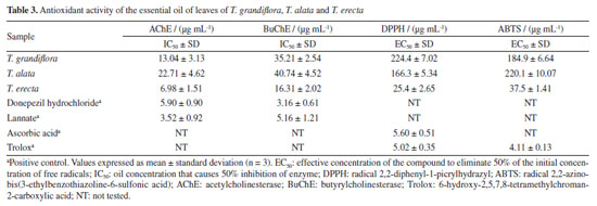 The analysis led to the separation of the oils into three distinct groups referring to the species studied. Seventy-three percent of the variability in the leaf and flower oils were explained by the first two components: PC1 (57%) and PC2 (25%). The separation among the groups determined by PCA of the leaf and flower oils mainly occurred due to the variation in the percentages of the compounds identified in the oils from T. grandiflora (germacrene B: 20.49 ± 0.78% in the leaf oil and 21.71 ± 0.77% in the flower oil, and germacrene D: 17.83 ± 0.75% in the leaf oil and 36.13 ± 1.30% in the flower oil), T. alata (β-caryophyllene: 34.13 ± 1.00% in the leaf oil and 23.40 ± 0.53% in the flower oil) and T. erecta (caryophyllene oxide: 28.92 ± 0.90% in the leaf oil and 25.19 ± 0.98% in the flower oil). The HCA revealed high similarity in the composition of the leaf and flower oils from the same species. The greatest similarity (92.14%) was found for the leaf and flower oils from T. alata. The lowest similarity (21.21%) was observed between the leaf and flower oils of T. erecta. This low similarity may be explained by the significant differences in the proportions of geranyl isovalerate (leaves: 19.32 ± 0.76%; flowers: 3.90 ± 0.27%) and the presence of numerous compounds in the flower oil that were not detected in the leaf oil. Studies on the determination of the chemical compounds of essential oils from species of the genus Thunbergia are scarce. Olaoluwa et al.32 found phytol (4.10%), i-propyl hexadecanoate (3.19%) and diisooctyl-1,2-benzenedicarboxylate (3.18%) as the major constituents of the leaf oil as well as methoxyl-phenyl-oxime (23.45%), Z-11-hexadecenoic acid (12.28%) and n-hexadecanoic acid (11.66%) as the major constituents of the essential oil from the stems of Thunbergialaevis collected in Nigeria. However, none of these constituents were found in the present analysis of species that occurred in the Atlantic Forest biome in the state of Pernambuco, Brazil. The in vitro inhibitory effect of essential oils from the leaves of Thunbergia species on the enzymes acetylcholinesterase (AChE) and butyrylcholinesterase (BuChE) is presented in Table 3.