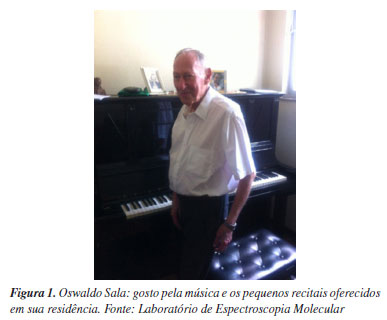TRAJETÓRIA BIOGRÁFICA (29/06/1926 - 07/12/2021) Nascido em Bauru em junho de 1926, Oswaldo Sala era filho de pai brasileiro, alfaiate, e mãe italiana, desenhista. Era também irmão de Oscar Sala, nascido na Itália (Milão) em 1922 e que viria a ter excepcional relevância no desenvolvimento da física nuclear no Brasil.1 Em sua infância e juventude teve bastante contato com a música clássica pois seu pai tocava violoncelo e fazia parte de um grupo musical que ensaiava suas apresentações semanalmente na própria residência. Tendo ingressado no curso de Física da FFCLUSP em 1944, mudou-se para São Paulo e o gosto pela música era nutrido por idas frequentes a concertos no Teatro Municipal. Sua esposa, dona Denize (Carmen Denize Sala), era professora de piano e também apreciadora de música clássica. Casaram-se em 1949 e tiveram três filhos, vários netos e bisnetos. Dona Denize foi uma incentivadora constante da carreira do esposo; isso certamente tornou possível sua intensa dedicação às atividades na Universidade que, não raro, avançavam pela madrugada ou atravessavam a noite, inclusive nos finais de semana. A tristeza pelos falecimentos de sua esposa (2004) e da bisneta (2011), com a qual convivia diariamente, fez com que ele, já aposentado, voltasse a se dedicar ao piano (Figura 1), oferecendo inclusive pequenos recitais às pessoas no seu círculo mais íntimo de relacionamento;2 também nesse período escreveu um livro de memórias em homenagem à bisneta falecida.3