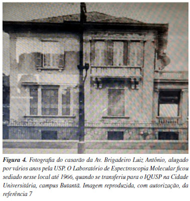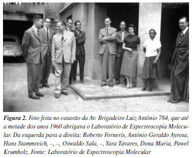 O LABORATÓRIO DE ESPECTROSCOPIA MOLECULAR O Laboratório de Espectroscopia Molecular foi criado por Hans Stammreich no final da década de 1940 e foi sediado durante algumas décadas em um casarão da Av. Brigadeiro Luiz Antônio, 784 (Figura 4).7 Esse casarão é descrito por Oscar Sala, irmão mais velho de Oswaldo, em depoimento dado em 1977: "Lembro perfeitamente: o Departamento de Física estava situado numa residência da Av. Brigadeiro Luís Antônio, 784. Era uma residência de dois andares e um porão. Eu trabalhava no porão, na parte de raios cósmicos e no resto da residência estava em desenvolvimento a parte para a defesa Nacional. Algumas salas eram, inclusive, inacessíveis".8