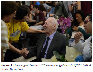 Começou a trabalhar em Regime de Dedicação Integral à Docência e à Pesquisa (RDIDP) em 1959; antes disso, entre 1955 e 1958 foi Professor contratado pela Faculdade de Filosofia São Bento da Pontifícia Universidade Católica de São Paulo, o que foi possível porque seu regime de trabalho na USP nesse período ainda não era de dedicação exclusiva. Fez estágio de pós-doutoramento no Mellon Institute (Pittsburgh, USA), com a supervisão do Prof. Foil A. Miller, em 1962/1963. Tornou-se Professor Regente do Departamento de Física da FFCL-USP em 1968, assim permanecendo até 1970 quando a Reforma Universitária foi implantada e promoveu a reestruturação das carreiras, ocasião em que passou a ser Professor Assistente Doutor. Na Reforma, optou por filiar-se ao recém-criado Instituto de Química (IQUSP) permanecendo como Professor Assistente Doutor até 1986 quando se tornou Prof. Livre-Docente, título obtido pelo Departamento de Química Fundamental do IQUSP com a tese intitulada "Intensificação do Espalhamento Raman por Ressonância e por Superfície: Princípios e Aplicações".5 No ano seguinte (1987), na mesma Instituição, ascendeu à posição de Professor Adjunto, título conferido pelo Departamento de Química Fundamental do IQUSP em concurso realizado em 17 de agosto; em 1988 tornou-se Professor Titular por aprovação em concurso público. Foi Vice-Chefe do Departamento de Química Fundamental no período de 1990 a 1993 e Vice-Diretor do IQUSP no período de 1994 a 1996. Foi membro da Sociedade Brasileira de Química e membro titular da Academia de Ciências do Estado de São Paulo, bem como da Academia Brasileira de Ciências. Recebeu do IQUSP o Prêmio Rheinboldt-Hauptmann em 1992 e, do Governo Federal, recebeu em 1998 o título de Comendador da Ordem Nacional do Mérito Científico. Foi também homenageado com a Medalha "Simão Mathias" (2000), honraria concedida pela Sociedade Brasileira de Química àqueles que se destacam por suas atividades acadêmicas. Foi homenageado na ocasião de seu 70º aniversário com um workshop (Modern Aspects of Vibrational Spectroscopy, IQUSP, 1996) que reuniu especialistas em espectroscopia Raman reconhecidos internacionalmente e originou um número especial da revista Journal of the Brazilian Chemical Society (JBCS);6 10 anos depois, a homenagem aconteceu com o Curso de Espectroscopia Vibracional Prof. Oswaldo Sala (Vibros I) que segue sendo oferecido pelo LEM. Recebeu ainda homenagem dos alunos de graduação em química em 2015 (Ano Internacional da Luz), durante a 32ª Semana de Química do IQUSP (Figura 3). Postumamente, em 2022, o Comitê Científico do Encontro Brasileiro de Espectroscopia Raman (EnBraER) criou o "Prêmio Oswaldo Sala" concedido como homenagem a pesquisadores que se destacaram por suas contribuições à espectroscopia Raman e à ciência brasileira.
