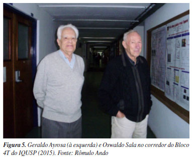 Segundo Oswaldo Sala, o LEM passou a ocupar todo o prédio quando grande parte do Departamento de Física transferiu-se para outros locais como o campus em construção no Butantã e o prédio da Rua Maria Antônia; com isso o LEM "herdou" uma oficina mecânica equipada com várias máquinas. O Laboratório contava nessa época com o auxílio de um técnico mecânico (Mario Capelo), o que foi importante porque o espectrógrafo Lane-Wells (que usava prismas), adquirido por Stammreich em 1947, tinha dispersão desfavorável na região do vermelho e, com a oficina, foi possível construir espectrógrafos com maior luminosidade, resolução e flexibilidade de montagem.9 Outra pessoa que nessa época foi imprescindível no apoio técnico em eletrônica ao LEM foi Antônio Geraldo Marques da Silva Ayrosa (na Figura 5, junto ao Prof. Sala), filho do engenheiro, etnologista, filólogo e professor Plínio Marques da Silva Ayrosa;10 o Prof. Plínio Ayrosa deu grande contribuição ao que viria a ser, anos mais tarde, o Museu de Arqueologia e Etnologia da USP.11 Geraldo Ayrosa (falecido em 2018)12 está também na fotografia da Figura 2, junto com Stammreich, funcionários e alunos de pós-graduação, além do Prof. Pawel Krumholz13 com quem Stammreich mantinha intensa colaboração. Krumholz faleceu repentinamente quatro anos depois de Stammreich, mas contribuiu decisivamente para a consolidação de linha de pesquisa do LEM voltada a estudos sobre compostos de coordenação usando espectroscopia Raman.