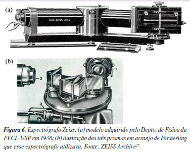 Quando iniciou seu trabalho com Hans Stammreich, Sala encontrou uma infraestrutura estabelecida, porque o Departamento de Física da FFCL-USP já tinha, em 1950, dois espectrógrafos Raman sendo um da Zeiss (esquematizado na Figura 6a) e outro da Lane-Wells. Um orçamento pedido pelo Departamento de Física e datado de 6/8/1937 (Proposta No. 1173) referente à aquisição de um espectrógrafo Zeiss com arranjo de Försterling14,15 (Figura 6b) e lâmpada de Hg foi encontrado em arquivos do atual Instituto de Física da USP;16 esse espectrógrafo muito provavelmente foi efetivamente comprado porque há uma nota de entrega datada de 6/12/1938 com assinatura de Abrahão de Moraes atestando o recebimento de um "tubo de quartzo (para lâmpada seg. Raman)".17 Esse equipamento estava, portanto, disponível na FFCL-USP 10 anos antes da contratação de Sala mas, até onde se tem conhecimento, não foi utilizado por Stammreich para espectroscopia Raman até o final da década de 1940.