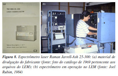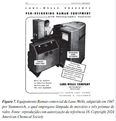 Não se conhece exatamente a razão pela qual, em 1947, Stammreich adquiriu um outro espectrógrafo Raman, da marca Lane-Wells (Figura 7),18 com lâmpada de mercúrio e três prismas de 10 cm de base, e que se tornou o primeiro em operação rotineira na América Latina. Segundo depoimento de punho próprio, Sala participou da instalação desse equipamento a qual, segundo ele, "foi bastante trabalhosa".9,19 Esse espectrógrafo foi empregado no primeiro artigo usando a espectroscopia Raman, publicado no Brasil em 1949, nos Anais da Academia Brasileira de Ciências,20 de autoria de Hans Stammreich e Berenice Gonçalves; aparentemente, o instrumento Zeiss comprado no final da década de 1930 pelo Departamento de Física não foi usado em publicações do grupo até 1953, quando Stammreich o utilizou para obter o espectro Raman de BrCl usando lâmpada de hélio,21 em um trabalho que tem a coautoria de Roberto Forneris.