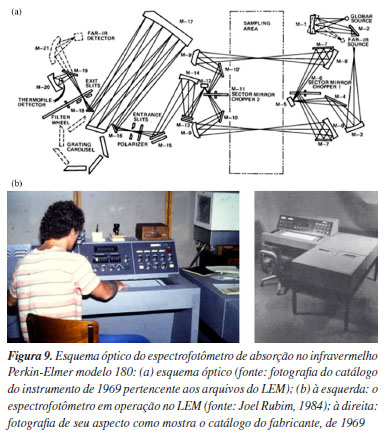TRANSFERÊNCIA DO LEM AO IQUSP A construção da Cidade Universitária no bairro do Butantã, a demanda judicial dos herdeiros do casarão da Av. Brigadeiro Luiz Antônio (que acelerou a transferência do laboratório para o campus do Butantã em 1966) e a morte inesperada de Hans Stammreich em 1969, antes portanto da vinculação oficial de seu grupo de pesquisa ao Instituto de Química (criado com a reforma universitária), trouxeram uma série de desafios a Oswaldo Sala, agora responsável pelo LEM e pela manutenção de sua infraestrutura. A fim de fazer frente às novas demandas de pesquisa, adquiriu em 1970 o primeiro instrumento que não mais operava com lâmpadas de descarga mas sim com lasers (Jarrell-Ash modelo 25-300, com duplo monocromador Czerny-Turner) e, do ponto de vista da técnica, teve papel pioneiro em investigações sobre o efeito Raman ressonante e, posteriormente, sobre o efeito SERS (surface enhanced Raman scattering), além de ter introduzido o uso de matrizes criogênicas de gases inertes em espectroscopia vibracional no Brasil. O espectrômetro Jarrell-Ash (Figura 8) entrou em operação no início de 1971 e, segundo Sala, "o projeto envolvia um valor muito alto para a época, US$50.000,00 (seriam cerca de US$300.000 ou $400.000 atualmente)".9 O primeiro artigo publicado empregando o recém-instalado espectrômetro (1971) versava sobre a caracterização de alguns tioacetais por espectroscopia vibracional, tema de pesquisa de Paulo R. Olivato e de sua então orientadora de doutorado Blanka Wladislaw ("The Infrared and Raman Spectra of some Thioacetals").42 Quando, nesse mesmo ano e com apenas alguns meses de diferença, o Departamento de Química Fundamental recebeu um espectrofotômetro de absorção no infravermelho Perkin-Elmer Modelo 180 (Figura 9), esses dois pesquisadores tiveram importante papel na decisão do Departamento de deixar o instrumento sediado no LEM, aos cuidados de Sala e sua equipe. O artigo sobre tioacetais citado acima42 também foi o primeiro publicado empregando o "180", como era conhecido o espectrofotômetro Perkin-Elmer, que permitia a obtenção de espectros com alta resolução espectral (com passos do monocromador de 0,1 ou 0,01 cm-1) e que operava com quatro redes de difração para a faixa espectral de 180 a 4000 cm-1.43 O equipamento era purgado para remover CO2 e vapor de H2O do compartimento de amostra e, para atingir o limite inferior de 180 cm-1, possuía óptica de KRS-5, uma mistura de iodeto e brometo de tálio.44