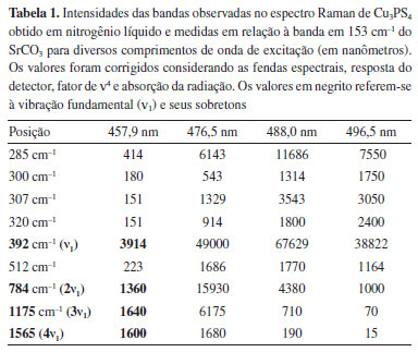 Esse equipamento foi bastante importante por permitir a obtenção de espectros no IR, com informações complementares às dos espectros Raman e também por possibilitar que novas linhas de pesquisa fossem criadas, como é o caso do estudo de moléculas aprisionadas em matrizes criogênicas de gases inertes. Acetamidas e seus derivados deuterados foram estudadas em matrizes de argônio (10 K). A alta resolução espectral foi fundamental para esse tipo de investigação porque, após a estabilização da temperatura e a formação da matriz, era feita primeiramente uma varredura exploratória do espectro todo e em seguida cada banda de interesse era registrada com alta resolução (0,6 cm-1) e baixa velocidade de varredura, em um experimento que se estendia por horas, geralmente até a manhã do dia seguinte. No caso das acetamidas, tema da tese de doutorado de Ricardo Knudsen,45 os resultados obtidos foram publicados e estão disponíveis na literatura.46 Matrizes criogênicas também foram empregadas em estudos sobre o comportamento vibracional e fotoquímico de acetaldeído,47 conduzidos por Carlos Della Védova, pesquisador da Universidade de La Plata (Argentina). A colaboração com outros pesquisadores Argentinos, como Alicia Jubert,48 Pedro J. Aymonino,49 Jorge Güida,50 Gabriela Lacconi51 e Alejandro J. Arvia52 foi intensa nesse período e os trabalhos citados são apenas alguns exemplos mais significativos das publicações que resultaram dessas colaborações. Especificamente no caso da espectroscopia Raman, quando a fonte de excitação dos espectros deixou de ser linhas de lâmpadas de descarga, uma nova etapa foi iniciada no LEM, na qual Sala sempre destacou a inestimável colaboração de Antônio Geraldo Ayrosa (o "Seu Ayrosa", como ficou conhecido no IQUSP), de seus alunos de pós-graduação (Darwin Bassi, Celso Ulysses Davanzo, Francisco Moral, Marcia L. de Vito Arruda (depois Marcia L. Arruda Temperini), Paulo Sergio Santos, Wanda de Oliveira, Yoshiyuki Hase e Yoshio Kawano) e do Prof. Kiyoyasu Kawai, visitante da Faculdade de Ciência da Universidade de Toyama (Japão) que o auxiliou na organização do laboratório nos primeiros tempos sem o Prof. Stammreich. Foi por sugestão do Prof. Kawai que foram iniciados os estudos sobre o íon tetratiofosfato (PS43-) com a substituição progressiva dos átomos de enxofre por átomos de oxigênio; esse projeto de pesquisa começou a ser desenvolvido por Marcia L. Arruda em sua iniciação científica e foi concluído em seu doutoramento.53 As mudanças espectrais observadas quando diferentes linhas de excitação eram usadas foram discutidas em termos do efeito Raman ressonante, ainda pouco conhecido na ocasião. Curiosamente, um dos primeiros espectros obtidos com lâmpada de He, no início da década de 1950, foi o do vapor de bromo,54 de intensa coloração alaranjada (λmáx = 420 nm); a excitação usada (587,6 nm), em condição de ressonância, permitiu observar os sobretons do modo fundamental, característico do efeito, mas o fenômeno não foi investigado naquela ocasião. Dos trabalhos desenvolvidos sobre o efeito Raman ressonante nesse período, foi possível mostrar que as intensidades das bandas Raman dependiam de sua posição dentro da banda de absorção eletrônica e que a intensidade dos sobretons somente diminui monotonicamente com o número quântico vibracional quando a frequência da radiação espalhada dos sobretons é menor do que a do máximo do perfil de excitação,55 como mostra a Tabela 1 abaixo. Nela, são reportados os valores de intensidade relativas das bandas observadas no espectro Raman de Cu3PS4 obtido em nitrogênio líquido e medidas em relação à banda em 153 cm-1 do SrCO3 para diversos comprimentos de onda de excitação; o máximo do perfil de excitação desse composto situa-se em 488 nm.