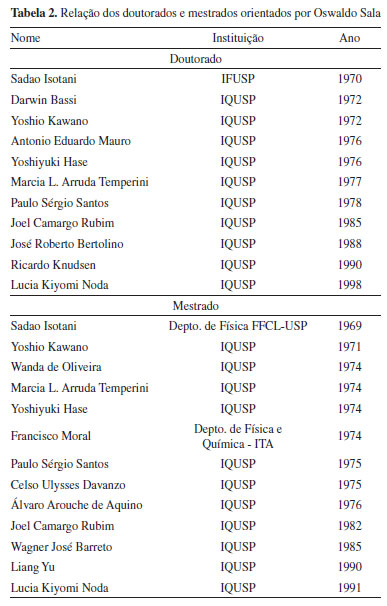 O MESTRE Desde sua contratação, Sala colaborava com a parte experimental da disciplina de Física Superior que era a cátedra do Prof. Stammreich, tarefa que começou a dividir com Roberto Forneris a partir de 1950. Desde aquela época tinha um carinho especial pelas disciplinas e buscava, segundo ele como o Prof. Stammreich fazia,70 o entrosamento perfeito entre o conteúdo teórico e as práticas de laboratório ou demonstrações, que ilustravam os pontos fundamentais da aula. Tanto nas disciplinas de graduação quanto nas de pós-graduação, Sala manteve ao longo de toda sua vida acadêmica um peculiar sistema de avaliação oral individualizada, durante a qual tinha a oportunidade de detectar deficiências ou complementar alguma informação relevante, estimulando no aluno o desenvolvimento de raciocínio crítico e científico. Ele acreditava que as avaliações eram oportunidades adicionais de aprendizado e não apenas instrumento gerador de notas e classificações. A partir das dúvidas mais recorrentes nessas aulas e preocupado com a formação dos estudantes, escreveu e publicou artigos didáticos sobre espectroscopia atômica,71-73 molecular74 e espectroscopia Raman,75 objetivando, segundo ele "tornar mais claros certos termos da Química Quântica". Além de textos de divulgação,76,77 é autor de um livro de espectroscopia vibracional ("Fundamentos de Espectroscopia Raman e no Infravermelho"),78 que é referência para os que querem se aprofundar nessas técnicas, e foi organizador e coautor de um livro sobre espectroscopia Raman ("Espectroscopia Raman. Princípios e Aplicações").70 Orientou 11 teses de doutorado e 13 dissertações de mestrado (Tabela 2), além de incontáveis projetos de Iniciação Científica. A grande maioria dos pós-graduandos que orientou seguiram exitosa carreira universitária, atuando em diversas áreas da Química e da Física, e os que não o fizeram também tiveram carreira de sucesso no setor privado.