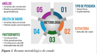 ABORDAGEM METODOLÓGICA Estudo de caso Este estudo baseia-se numa pesquisa qualitativa, de natureza descritiva e exploratória, utilizando o estudo de caso como estratégia metodológica, conforme a perspectiva de José Carlos Morgado,35,36 que o compreende como uma investigação empírica voltada à compreensão aprofundada de fenômenos educativos em seus contextos reais. Essa abordagem é especialmente relevante para analisar as práticas, os processos e os impactos do programa 1000 Futuros Cientistas (1000FC), considerando suas múltiplas dimensões: formativa, institucional e social. O objetivo concentra-se em compreender os efeitos do programa na formação de graduandos e pós-graduandos da UFMG, bem como na popularização da ciência entre estudantes da educação básica (EB), especialmente em escolas públicas. A abordagem qualitativa permite captar as percepções e experiências dos sujeitos envolvidos, reconhecendo a complexidade dos contextos educacionais e a natureza dinâmica das práticas extensionistas. A análise do caso contempla dados documentais, registros de atividades, observações realizadas no decorrer do programa e depoimentos espontâneos de participantes, produzidos ao longo de cinco anos de execução. Essa metodologia também se ancora na pesquisa-formação, que valoriza o protagonismo dos sujeitos e a dimensão formativa da extensão universitária. Além disso, o estudo de caso oferece evidências detalhadas que contribuem para a compreensão das estratégias de integração entre ensino, pesquisa e extensão e podem subsidiar a replicação de práticas inovadoras em outros contextos acadêmicos e escolares. A análise descritiva das ações do 1000FC fornece uma visão consistente dos desafios enfrentados e dos resultados alcançados, tanto do ponto de vista educacional quanto social. Contextualização e escolha dos participantes do estudo O estudo foi realizado no contexto do programa 1000FC no período de 2018 a 2025, com a participação direta de estudantes universitários, que atuam como mentores, mediadores e organizadores nos projetos. A amostragem intencional contemplou sujeitos envolvidos diretamente com o programa, distribuídos em três grupos principais: (i) graduandos e pós-graduandos que atuaram ou atuam nas ações do programa; (ii) professores da EB que participaram no desenvolvimento colaborativo de produtos nos projetos e foram responsáveis pelo acompanhamento e apoio das atividades nas escolas; (iii) estudantes da EB que são o público-alvo das atividades de divulgação e experimentação científica. Instrumentos de coleta de dados Análise documental A análise documental envolveu a utilização de mais de 140 documentos produzidos entre 2018 e 2025, exclusivamente referentes a ações formalizadas no sistema de extensão da UFMG. Foram considerados relatórios de atividades dos projetos, atas de reuniões, formulários preenchidos por graduandos, pós-graduandos, professores da educação básica e coordenadores do programa, registros fotográficos, materiais desenvolvidos (jogos, oficinas, experimentos, entre outros), artigos e resumos publicados em anais de eventos, além de monografias e dissertações relacionadas ao programa. Também foi utilizado como fonte complementar o site institucional https://1000fc.qui.ufmg.br/1000-fc/,37 que reúne o registro das ações do programa e disponibiliza os relatórios anuais de atividades. Esses documentos foram organizados por público-alvo e por ação, permitindo uma análise comparativa orientada pelas categorias temáticas estabelecidas na metodologia. A análise dos materiais forneceu subsídios para compreender as percepções dos participantes quanto aos impactos das atividades no desenvolvimento acadêmico e profissional, além de identificar os desafios enfrentados durante a execução do programa. No caso específico dos estudantes da educação básica, foram analisadas 6932 respostas a questionários aplicados antes e após as atividades, com foco na mudança de percepção sobre ciência, universidade e escolha profissional. Os dados qualitativos desses questionários foram processados por meio de codificação temática. Observação participante As atividades práticas do programa - como oficinas, experimentos, exposições e jogos - foram acompanhadas presencialmente pelas pesquisadoras e pesquisadores com o objetivo de identificar as estratégias pedagógicas utilizadas e as interações entre os participantes. Para isso, foram utilizados diários de campo estruturados, preenchidos durante a realização das ações. Os registros se concentraram nas interações entre estudantes, monitores, professores e membros da equipe executora, possibilitando a identificação de elementos relacionados ao engajamento, protagonismo estudantil e dinâmicas de mediação. Procedimentos de análise A análise dos dados foi conduzida com base na Análise de Conteúdo proposta por Bardin,38 utilizando categorias definidas a priori, alinhadas aos objetivos da pesquisa.39,40 O processo de análise envolveu três etapas: a pré-análise, com leitura flutuante e organização dos dados; a exploração do material, com codificação e categorização dos conteúdos relevantes; e o tratamento dos resultados obtidos, com inferências e interpretações à luz do referencial teórico. Foram estabelecidos três critérios temáticos principais: (i) o desenvolvimento de habilidades em graduandos e pós-graduandos, considerando aspectos como comunicação científica e pedagógica, trabalho em equipe, liderança e pensamento crítico; (ii) os impactos nas percepções de estudantes da educação básica (EB), com ênfase no interesse e motivação pelo aprendizado de ciências, na compreensão de conceitos científicos e sua aplicação prática; e (iii) a integração entre ensino, pesquisa e extensão, especialmente no que se refere à aplicação do conhecimento acadêmico em contextos re