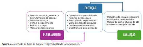 RESULTADOS E DISCUSSÃO Após análise dos materiais disponíveis, observou-se que os sete projetos vinculados ao programa seguem uma estrutura metodológica comum composta por três etapas: planejamento, execução e avaliação. O planejamento envolve a definição de objetivos específicos, organização e logística. Na etapa de execução, são realizadas atividades práticas em laboratórios, oficinas itinerantes, experimentos interativos e elaboração de materiais que envolvem graduandos, pós-graduandos, professores e estudantes da educação básica (EB). A etapa de avaliação inclui análise de questionários aplicados antes e após as atividades, relatos qualitativos e análises quantitativas dos impactos gerados. Projeto "Experimentando Ciências no DQ" O projeto oferece visitas orientadas aos laboratórios do Departamento de Química (DQ) da UFMG, permitindo que estudantes da educação básica (EB) realizem experimentos em um ambiente acadêmico e científico. Essas visitas visam proporcionar uma experiência prática enriquecedora, ampliando o entendimento da ciência e despertando o interesse por carreiras científicas. A Figura 2 apresenta o fluxo de atividades do projeto.