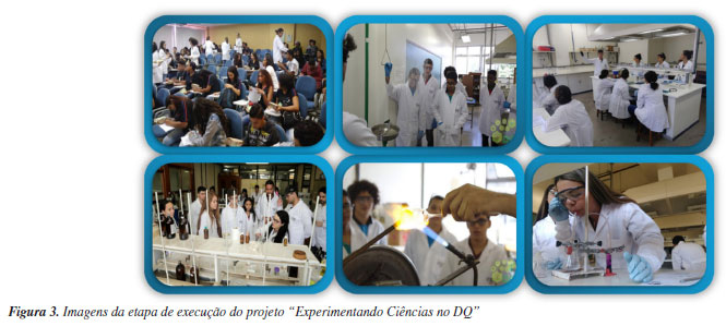 As visitas são realizadas em laboratórios de ensino e pesquisa, com capacidade para atender 90 estudantes por visita. Durante o período de 2018 a 2020, o projeto atendeu 3926 estudantes da EB, 133 professores da EB e 55 escolas públicas de Minas Gerais. Esses números refletem uma adesão significativa das escolas públicas participantes. Entre outubro de 2018 e março de 2020, período interrompido pela pandemia da COVID-19 (doença do coronavírus) e retomado apenas em 2023, o projeto atendeu 55 escolas e 3.926 estudantes da educação básica, superando, em mais de 200%, a capacidade inicialmente prevista de atendimento, estimada em 18 escolas por ano, com limite operacional de duas escolas por mês. As inscrições para participação no projeto ficaram abertas por apenas 15 dias e foram encerradas após a quantidade de escolas inscritas ultrapassar significativamente a capacidade da equipe executora. A decisão visou garantir a qualidade das atividades e evitar a criação de expectativas em escolas que, naquele momento, não poderiam ser atendidas. O elevado número de escolas que demonstraram interesse, mesmo antes da divulgação de resultados consolidados, pode ser interpretado como um forte indicativo da aceitação do projeto pela comunidade escolar, refletindo a confiança nas ações propostas, ainda que a limitação de vagas tenha impedido o atendimento de toda a demanda. Vale destacar que essas 55 escolas atendidas se referem exclusivamente ao período anterior à pandemia. Durante a crise sanitária da COVID-19, as atividades do projeto foram suspensas, e o período de 2022 a 2023 foi destinado à reorganização interna e ao fortalecimento da gestão. As atividades com as escolas foram retomadas apenas no segundo semestre de 2023 e, por esse motivo, os dados referentes a esse novo ciclo de execução não foram incorporados à análise deste artigo. Das escolas recebidas, 14 foram municipais e 41 estaduais. Esta diferença justifica-se devido às atividades em laboratórios de ciências e química serem mais comuns a partir do 9º ano do ensino fundamental, sendo ainda mais frequentes no ensino médio, que geralmente está sob a responsabilidade da rede estadual. As atividades são conduzidas por uma equipe de docentes, técnicos, graduandos e pós-graduandos, que atuam como mediadores do conhecimento. O impacto positivo do projeto é evidenciado por depoimentos de estudantes e professores, bem como por análises qualitativas e quantitativas dos questionários aplicados antes e após as visitas. A Figura 3 mostra imagens da etapa de execução do projeto no DQ. As imagens apresentadas neste artigo foram obtidas em atividades registradas no âmbito do programa 1000 Futuros Cientistas. Todas as escolas participantes assinam um termo de parceria que prevê a autorização para uso de imagem dos estudantes nas ações do programa, sendo responsabilidade das escolas a coleta e guarda dos termos individuais de autorização dos responsáveis legais dos alunos menores de idade.