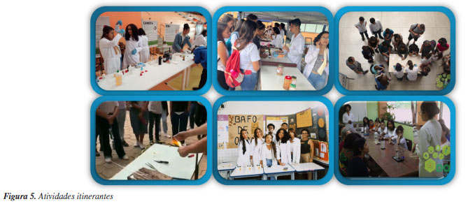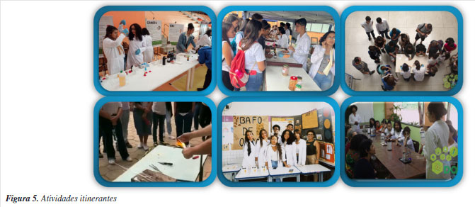 Por meio das oficinas itinerantes, o projeto atendeu cerca de 188 escolas de diferentes redes de ensino (municipal, estadual, federal e particular), ampliando a democratização do conhecimento científico. Foram mais de 16.200 estudantes da educação infantil, ensino fundamental, ensino médio e educação de jovens e adultos. O número de professores da EB envolvidos ultrapassou 370. As oficinas foram projetadas para serem reproduzidas em escolas ou ambientes externos, permitindo que professores e estudantes da EB mantenham contato com os experimentos mesmo após o término das atividades, o que potencializa a continuidade do aprendizado científico, mesmo em regiões mais afastadas. A Figura 5 ilustra momentos registrados nas oficinas itinerantes.