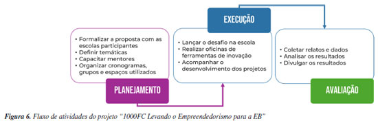 Em Minas Gerais, foram realizadas onze atividades, sendo que três foram eventos de abrangência nacional (Congresso Nacional de Inovação e Popularização da Ciência, CNIPC), onde se inscreveram participantes das 27 Unidades da Federação e de 6 países além do Brasil. Apesar do grande sucesso do projeto, um desafio importante foi identificado, que é relacionado à logística de deslocamento, que exige transporte adequado para materiais e voluntários. Para superar esse desafio, recomenda-se o estabelecimento de parcerias com instituições e empresas locais para apoio logístico. Uma estratégia de sucesso identificada pelo programa é oferecer às instituições parceiras meios eficazes para divulgar ações sociais e iniciativas de incentivo à educação promovidas por elas, alinhando essas ações às estratégias de ASG (Ambiental, Social e Governança) atualmente adotadas pelas empresas. O 1000FC Pelo Mundo destaca-se pela sua capacidade de ampliar o alcance da divulgação científica, para comunidades que não têm acesso direto ao ambiente universitário. Com um impacto significativo em termos de número de estudantes, escolas e professores atendidos, o projeto reforça a importância das atividades itinerantes para a democratização do conhecimento científico. Projeto "1000FC Levando o Empreendedorismo para a Educação Básica" O projeto busca estimular o pensamento criativo e empreendedor nos estudantes, conectando ciência e inovação à resolução de problemas reais das comunidades escolares. Além disso, incentiva o desenvolvimento de competências como trabalho em equipe, liderança e pensamento crítico, capacitando jovens a se tornarem agentes de transformação. O projeto é desenvolvido ao longo de três meses, com carga horária total de 120 horas. A Figura 6 apresenta as etapas do projeto. A etapa de planejamento aborda o estabelecimento de parcerias com professores e gestores escolares, para apoiar a implementação do projeto na escola; a definição de desafios temáticos relacionados a problemas reais vividos pelas comunidades escolares; o estabelecimento de objetivos voltados para desenvolver competências empreendedoras, como criatividade, resolução de problemas e trabalho em equipe; a disponibilização de material de apoio para auxiliar no processo de ideação e prototipagem; a capacitação de graduandos e pós-graduandos que recebem a formação sobre metodologias ágeis, design thinking e outras ferramentas de gestão de projetos, para atuarem como mentores dos estudantes da EB; e a organização de cronogramas, recursos, grupos de trabalho e espaços para as atividades práticas.