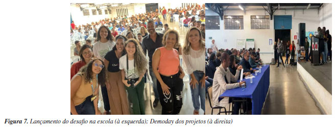 Na etapa de execução acontecem o lançamento dos desafios com uma palestra introdutória sobre a temática e a cultura de inovação, oficinas práticas para apresentação de ferramentas de inovação e empreendedorismo que são utilizadas para o desenvolvimento dos projetos e a condução das mentorias personalizadas, onde a cada equipe de estudantes da EB se somam 2 a 4 mentores (discentes da UFMG) que orientam e acompanham as atividades. Na etapa de avaliação, os trabalhos desenvolvidos pelas equipes, bem como os resultados e impactos das atividades de extensão, são analisados. O processo de avaliação dos trabalhos inclui um Demoday, no qual as equipes realizam apresentações curtas em formato de pitch para uma banca avaliadora e para toda a comunidade escolar, demonstrando a viabilidade técnica, econômica e social de suas propostas. A avaliação da extensão, por sua vez, envolve a coleta de percepções sobre a experiência por meio de questionários, o registro de relatos dos participantes, a análise dos resultados para identificar estratégias replicáveis em edições futuras, além da elaboração de relatórios e divulgação dos resultados alcançados. Dos trabalhos apresentados nas edições realizadas, surgiram três novos projetos que estão em execução: (i) uma startup que tem foco no desenvolvimento de aplicações para o resíduo de vidro (Green Glass Solutions); (ii) um projeto de implementação de empreendedorismo social com foco na economia criativa para produção de eco joias e (iii) um projeto de implementação de empreendedorismo social em uma comunidade quilombola no município de Itabira, que tem como foco a produção de tijolos ecológicos. Este projeto destaca-se pela sua capacidade de integrar ciência, criatividade e inovação no contexto escolar, incentivando os estudantes a desenvolverem soluções reais para problemas locais. Além de impactar diretamente os estudantes da EB, o projeto promove o desenvolvimento de competências pedagógicas e interpessoais nos mentores participantes. A Figura 7 ilustra uma das edições do projeto na cidade de Sete Lagoas.