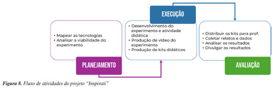 Um desafio identificado foi a necessidade de capacitação contínua de mentores, para assegurar o suporte técnico e pedagógico às equipes. Uma possível estratégia para a mitigação, seria criar um manual de boas práticas e realizar treinamentos regulares antes de cada edição. Projeto "Inspirati" O projeto Inspirati consiste numa iniciativa inovadora, que desenvolve recursos educacionais fundamentados em tecnologias universitárias, conectando pesquisas acadêmicas ao contexto escolar. Conduzido em parceria com professores e estudantes da EB, o projeto promove uma abordagem pedagógica que alia ciência, criatividade e ensino por investigação, incentivando o aprendizado ativo e colaborativo. A metodologia do projeto, representada na Figura 8, segue uma sequência estruturada de etapas que envolvem planejamento colaborativo, desenvolvimento de materiais e avaliação contínua, com participação expressiva dos professores da EB e estudantes universitários. As atividades são organizadas de maneira a garantir que os materiais produzidos sejam atrativos, adotando uma linguagem clara e adaptada à realidade escolar.