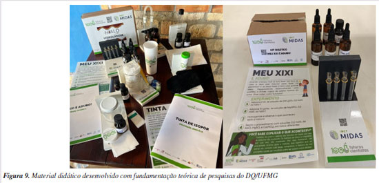 Os materiais desenvolvidos destacam-se por integrar múltiplas disciplinas, permitindo que os estudantes compreendam a ciência como uma área interdependente. Por exemplo, a Química e a Biologia que são abordadas em experimentos com o ensino fundamental e enfatizam conceitos como processos metabólicos; a Química e a Matemática abordadas em atividades envolvendo cálculos de proporções e análise gráfica. Os dados indicam que o contato direto com experimentos químicos não apenas melhora o entendimento dos conceitos científicos, mas também fomenta o interesse dos estudantes em seguir carreiras em Ciência, Tecnologia, Engenharia e Matemática (STEM). Essa constatação é corroborada por Silva et al.,22 que observaram maior engajamento de estudantes após atividades práticas. Ademais, a metodologia CTSA utilizada pelo programa permite aos estudantes compreenderem a ciência como uma ferramenta interdisciplinar e aplicável na resolução de problemas reais, promovendo a autonomia e a criatividade no aprendizado. A Figura 9 ilustra alguns kits desenvolvidos pelo projeto, compostos por vídeo instrucional, atividade didática, materiais, reagentes e roteiro de experimento. É importante destacar que o desenvolvimento desses kits é realizado de forma colaborativa entre a equipe do projeto e os professores da EB, o que garante sua aplicabilidade em sala de aula e conecta a demanda por divulgação científica às necessidades das escolas por materiais contextualizados à realidade dos estudantes.