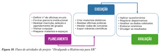 Apesar dos resultados positivos, o projeto enfrenta o desafio de garantir a captação contínua de recursos financeiros, indispensáveis para a execução de suas atividades. Como solução, propõe-se a formação de parcerias interinstitucionais para financiar e distribuir materiais a escolas de diferentes regiões, além do desenvolvimento de uma plataforma online para disponibilizar os recursos produzidos, ampliando seu alcance e impacto. Outra estratégia consiste em estabelecer conexões com empresas interessadas em divulgar suas tecnologias, posicionando-se como instituições comprometidas com a valorização da educação no país. O projeto Inspirati exemplifica como a universidade pode atuar como um elo entre a pesquisa e a educação básica, oferecendo soluções criativas e que transformam a dinâmica das aulas de ciências, ao mesmo tempo que divulga tecnologias e pesquisas desenvolvidas dentro da universidade. A abordagem interdisciplinar e o foco no aprendizado investigativo tornam o projeto uma referência em inovação pedagógica. Projeto "Divulgando a Hialotecnia para a Educação Básica" O projeto promove a divulgação científica por meio de oficinas, demonstrações práticas e materiais didáticos sobre hialotecnia - a técnica de manipulação e produção de vidrarias científicas. Com foco na interdisciplinaridade entre ciência, tecnologia, arte e sustentabilidade, as atividades são realizadas em conjunto com os outros projetos e aproxima os estudantes da EB de um campo pouco conhecido, despertando a curiosidade científica e reforçando a importância do uso sustentável de materiais. As atividades práticas fazem uso de materiais educativos que facilitam a compreensão dos processos da hialotecnia, abordando aspectos sobre o vidro como: conceitos de fusão, modelagem, conformação, aplicações científicas e industriais, ciclo de vida e processos de reciclagem por meio dos quais os estudantes entendem a importância da sustentabilidade no manejo de resíduos. A Figura 10 apresenta as etapas do projeto e as principais atividades desenvolvidas.