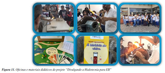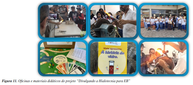 As oficinas são realizadas dentro do Laboratório de Hialotecnia (LabHialo), no Departamento de Química da UFMG e em ambientes externos, permitindo maior alcance e acesso a outras escolas. Já foram realizadas 150 oficinas de demonstração para mais de 2500 estudantes da EB. Também foram distribuídos 3500 materiais didáticos, como cartilhas e jogos. A Figura 11 ilustra a etapa de execução das oficinas e os materiais didáticos produzidos.