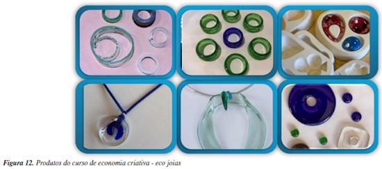 A participação dos estudantes nas oficinas trouxe resultados qualitativos expressivos, como: despertar a curiosidade científica nos estudantes que relataram maior interesse em explorar a ciência por meio de atividades práticas, principalmente depois do contato direto com o processo de manipulação do vidro. Outro resultado que pode ser citado é a conscientização sobre a sustentabilidade, após discussões sobre o ciclo de vida do vidro e os processos de reaproveitamento, que incentivam uma visão crítica sobre o consumo e descarte de materiais. Projeto "Hialotecnia, Arte e Sustentabilidade" Este projeto amplia o alcance da hialotecnia ao introduzir conceitos de empreendedorismo e economia criativa, capacitando interessados a trabalhar com vidro de forma inovadora e sustentável. Durante os cursos, os participantes aprendem a produzir objetos vítreos utilizando técnicas de vitro-fusão e modelagem, recebem capacitação sobre conteúdos relativos a empreendedorismo e sustentabilidade incorporados ao desenvolvimento de soluções socioambientais inovadoras. Foram realizadas quatro oficinas de capacitação com a participação de cinco escolas públicas e 440 participantes inscritos. No total foram desenvolvidos 58 projetos com o objetivo de fomentar o pensamento empreendedor e a criatividade usando como matéria-prima vidros descartados. A Figura 12 ilustra alguns protótipos obtidos por participantes das oficinas. Os produtos desenvolvidos nas capacitações demonstram a relevância da hialotecnia como ferramenta educativa, ao promover impacto educacional, ampliando o conhecimento dos estudantes sobre a ciência dos materiais e práticas sustentáveis. O impacto social pode ser percebido na formação de futuros empreendedores e na geração de renda por meio do reaproveitamento do vidro como matéria prima em ações de economia circular.
