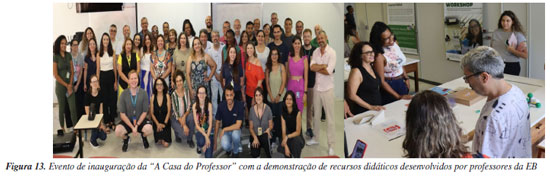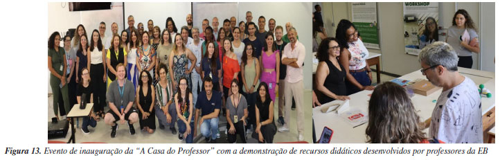 Foram identificados alguns desafios como a infraestrutura escolar limitada de algumas escolas que não possuem espaço adequado para replicar as atividades práticas. Outro desafio está relacionado ao financiamento das atividades, pois a manutenção de materiais e a ampliação do alcance do projeto dependem de apoio financeiro contínuo. Para atender a estes desafios foi desenvolvido um protótipo de kit portátil de hialotecnia, que está em fase de testes, para facilitar a replicação das atividades nas escolas. Projeto "A Casa do Professor": centro de integração Química/UFMG - professores da educação básica Projeto de extensão universitária criado no final de 2024 e registrado no sistema de extensão em 2025. O projeto é vinculado ao programa 1000 Futuros Cientistas e foi idealizado no contexto de uma disciplina da pós-graduação em Química da UFMG, com o objetivo de aproximar os diferentes níveis de ensino por meio de práticas formativas integradas. A proposta surge como uma resposta concreta à necessidade de conectar o saber acadêmico da pós-graduação à realidade da educação básica, promovendo uma formação docente mais sensível, interdisciplinar e comprometida com os desafios sociais. Além disso, busca oferecer a pós-graduandos e pós-graduandas oportunidades de vivência mais próxima com o cotidiano escolar, considerando que muitos concluem seus cursos e passam a atuar como docentes na educação básica, especialmente em escolas técnicas. O projeto estabelece um espaço de formação colaborativa que articula ensino, pesquisa e extensão, reunindo pós-graduandos, graduandos, professores da educação básica e estudantes de escolas públicas em ações que promovem a cultura científica, o pensamento crítico e a inovação pedagógica. As atividades desenvolvidas pelo projeto A Casa do Professor incluem oficinas formativas, mentorias interativas, vivências em espaços escolares e laboratoriais, desenvolvimento de materiais didáticos, produção científica e acompanhamento de projetos escolares com abordagem STEAM (metodologia de ensino interdisciplinar que integra Ciências, Tecnologia, Engenharia, Artes e Matemática). Desde sua criação, o projeto já envolveu diretamente 22 professores da educação básica, 15 graduandas(os) e 9 pós-graduandas(os) em ações formativas continuadas, como a estruturação de propostas para editais e o desenvolvimento de ementas e conteúdo para cursos de formação. A atuação é marcada pela escuta ativa das demandas das escolas, valorizando o protagonismo dos sujeitos envolvidos e a produção coletiva do conhecimento. A Figura 13 traz um evento de demonstração de recursos didáticos desenvolvidos no programa 1000FC durante a inauguração do espaço da Casa do Professor.