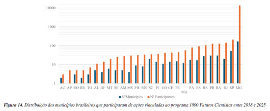 A abrangência geográfica demonstrada na Figura 14 reflete o número de municípios brasileiros que participaram de ao menos uma atividade promovida pelo programa 1000 Futuros Cientistas entre 2018 e 2023. Embora a equipe gestora esteja sediada em Belo Horizonte (MG) a atuação nacional foi viabilizada graças à integração entre os projetos vinculados ao programa. Projetos como 1000FC Pelo Mundo e Inspirati realizaram oficinas itinerantes e remotas, enquanto o CNIPC e o projeto 1000FC Levando o Empreendedorismo para a EB contaram com edições híbridas e mentorias online, permitindo o envolvimento de escolas de outras regiões. A rede de execução também foi ampliada por meio de parcerias com universidades federais, secretarias de educação e participação em editais nacionais, que fomentaram a inclusão de voluntários externos e a disseminação das ações para além do estado de Minas Gerais. A menor participação em alguns municípios reflete desafios logísticos ou falta de continuidade local, aspectos que estão sendo trabalhados em novos ciclos do programa. A distribuição desigual entre os estados, com destaque para Minas Gerais (MG), São Paulo (SP) e Rio de Janeiro (RJ), reflete diferenças em infraestrutura, adesão ao programa e facilidade de acesso. Esses estados concentram a maior parte dos municípios atendidos e dos participantes. Isso pode estar relacionado a fatores como maior densidade populacional, proximidade geográfica das sedes das atividades e maior número de instituições de ensino básico. Por outro lado, estados como Acre (AC), Amapá (AP), Rondônia (RO) e Roraima (RR) possuem uma representatividade reduzida, o que pode ser indicativo de desafios logísticos, falta de infraestrutura ou baixa divulgação nas regiões Norte e Centro-Oeste. A alta concentração de participantes em determinados estados sugere que o programa pode estar mais consolidado nessas regiões, possibilitando maior impacto. Isso abre a possibilidade de investigar quais fatores contribuíram para o sucesso nessas localidades e como essas práticas podem ser replicadas em outras regiões. A Figura 14 também reforça a necessidade de ampliar a atuação em estados menos representados, promovendo iniciativas específicas, como parcerias com instituições locais, atividades remotas (plataformas digitais), e eventos itinerantes para alcançar municípios mais afastados. A relação entre o número de municípios atendidos e o número de participantes por estado pode indicar o alcance médio por município. Estados com poucos municípios atendidos, mas com alto número de participantes, podem estar centralizando as atividades em localidades específicas, enquanto estados com proporção inversa indicam maior capilaridade do programa. A Figura 15 apresenta os indicadores gerais do programa 1000FC, destacando sua ampla abrangência e impacto significativo, demonstrando alinhamento com os critérios temáticos definidos na metodologia do estudo.