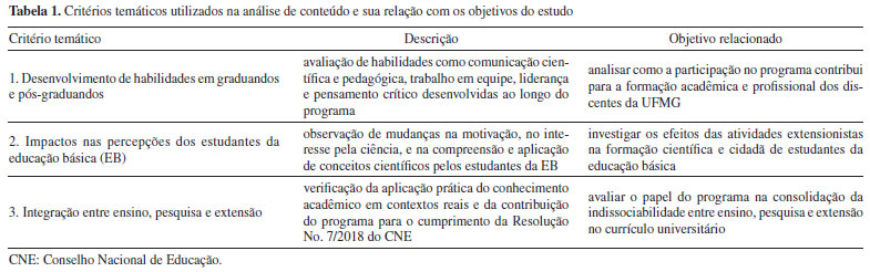 Para além do levantamento de dados quantitativos, foram consideradas evidências qualitativas registradas em relatórios dos discentes, reuniões de avaliação, entrevistas abertas e registros audiovisuais dos eventos. A triangulação entre esses dados permitiu identificar, com base nas narrativas dos participantes, transformações em suas habilidades interpessoais, como autonomia, liderança, comunicação e resolução de problemas. A escuta ativa desses relatos foi essencial para compreender as múltiplas dimensões formativas do programa. Os critérios utilizados para relacionar com os objetivos da pesquisa estão sistematizados na Tabela 1.