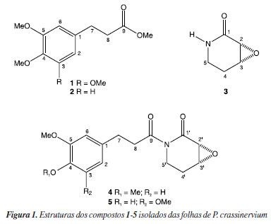 PARTE EXPERIMENTAL Procedimentos gerais Sílica 60 (Merck, 230-400 mesh) ou Sephadex LH-20 (Amersham-Bioscience) foram utilizadas em procedimentos de cromatografia em coluna aberta enquanto que sílica 60 PF254 (Merck) foi utilizada nas análises em camada delgada (analítica e preparativa). Os espectros de massas (EM) de baixa resolução foram registrados em espectrômetro INCOS SO Finnigan - Mat (quadrupolo) via ionização por elétrons (IE) a 70 eV acoplado ao cromatógrafo 3400 Varian, equipado com coluna capilar DB-5 de 30 m de comprimento e 0,25 mm de diâmetro. Os espectros de massas de alta resolução (EMAR) foram registrados em espectrômetro Bruker Daltonics q-ToF Maxis, operando por ionização por electrospray, em modo positivo. Os espectros de ressonância magnética nuclear (RMN) foram registrados em espectrômetros Bruker DPX-300 (1H: 300 MHz e 13C: 75 MHz), Avance III (1H: 500 MHz e 13C: 125 MHz) e Varian Inova (1H: 500 MHz e 13C: 125 MHz). CDCl3 foi utilizado como solvente e tetrametilsilano (TMS) como referência interna. Material vegetal As folhas de P. crassinervium foram coletadas no Parque Estadual Fontes do Ipiranga em São Paulo/SP, Brasil, em abril de 2015 recebendo o código de coleta SISGEN A4123E4. Uma exsicata foi depositada no Herbário do Instituto de Biociências da Universidade de São Paulo (IB-USP) sob número SPF 218827. Extração e isolamento dos constituintes químicos As folhas de P. crassinervium, secadas e moídas (57 g), foram extraídas com hexano (3 × 100 mL) via maceração a frio. Após evaporação do solvente sob pressão reduzida, foram obtidos 2,8 g de extrato hexânico. Parte desse extrato (1,0 g) foi submetida a fracionamento cromatográfico em gel de sílica utilizando-se misturas de hexano/AcOEt (9:1, 8:2, 7:3, 6:4, 1:1, 4:6, 3:7, 2:8 e 1:9) fornecendo nove grupos (A-I). Após avaliação do potencial anti-T. cruzi in vitro, foi observado que os grupos C (39 mg), D (120 mg), G (55 mg) e H (63 mg) apresentavam atividade (100% de morte do parasita a 200 μg mL-1). O grupo C mostrou-se constituído por 4 na forma pura. Parte do grupo D (100 mg) foi purificado via CCDP (cromatografia de camada delgada preparativa) de gel de sílica, eluida com hexano/AcOEt (1:1), fornecendo 1 (28 mg) e 2 (48 mg). Parte dos grupos G (50 mg) e H (60 mg) foram purificados via coluna de gel de sílica utilizando-se misturas de hexano/AcOEt (7:3, 1:1 e 3:7) como eluentes, fornecendo 5 (18 mg) e 3 (8 mg), respectivamente. 4-Hidroxi-3,5-dimetoxifenilpropanoil-2'α,3'α-epoxi-1'-piperidona (5) Sólido branco amorfo. RMN 1H (500 MHz, CDCl3) δ 3,21 (m, H-8), 2,89 (dt, J 7,9 e 2,0 Hz, H-7), 6,47 (sl, H-2/H-6), 3,59 (d, J 4,0 Hz, H-2'), 3,71 (dd, J 4,0 e 3,1 Hz, H-3'), 2,43 (dl, J 15,2 Hz, H-4'a), 2,00 (ddd, J 15,5, 13,4 e 5,5 Hz, H-4'b), 3,19 (m, H-5'a), 4,33 (dddd, J 13,4, 5,5, 1,3 e 1,3 Hz, H-5'b), 3,87 (s, 3- e 5-OCH3); RMN 13C (125 MHz, CDCl3) δ 174,8 (C-9), 41,7 (C-8), 31,0 (C-7), 131,6 (C-1), 104,8 (C-2), 146,8 (C-3), 132,7 (C-4), 146,8 (C-5), 104,8 (C-6), 169,8 (C-1'), 52,4 (C-2'), 53,6 (C-3'), 23,7 (C-4'), 35,7 (C-5'), 56,2 (s, 3- e 5-OCH3). EMAR (ionização por electrospray, modo positivo) m/z 322,1287 [M + H]+ (calculado para C16H20NO6, 322,1291). Parasitas e manutenção de células de mamíferos Tripomastigotas de T. cruzi (cepa Y) foram mantidos em células de rim de macaco Rhesus (LLC-MK2, ATCC (American Type Culture Collection)), cultivadas em meio RPMI-1640 (Roswell Park Memorial Institute-1640) suplementado com 2% de SFB (soro fetal bovino) a 37 °C em uma incubadora umidificada com 5% de CO2. Macrófagos foram coletados da cavidade peritoneal de camundongos BALB/c lavando-os com meio RPMI-1640 suplementado com 10% de SFB e foram mantidos a 37 °C em uma incubadora umidificada com 5% de CO2. As células conjuntivas murinas (NCTC clone 929, ATCC) e LLC-MK2 (ATCC) foram mantidas em RPMI-1640 suplementado com 10% de SFB a 37 °C em uma atmosfera umidificada contendo 5% de CO2.24,25 Determinação do potencial frente as formas tripomastigotas de T. cruzi Tripomastigotas obtidos de culturas de LLC-MK2 foram contados em um hemocitômetro (Thermo Fisher Scientific) e semeados em microplacas a 1 × 106/poço. Para determinar os valores de concentração efetiva 50% (CE50), os compostos 1-5 e benznidazol (fármaco padrão) foram dissolvidos em DMSO (dimetilsulfóxido), diluídos em meio RPMI-1640 e mantidos por 24 h a 37 °C em uma incubadora umidificada com 5% de CO2. A viabilidade dos tripomastigotas foi verificada pelo ensaio de resazurina (Alamar Blue®) usando um leitor de microplacas (FilterMax F5 Multi-Mode Microplate Reader) com comprimentos de onda de excitação e emissão de 540 e 595 nm, respectivamente.25 Determinação da toxicidade frente a células de mamíferos Células NCTC-clone L929 (6 × 104 células/poço) foram semeadas e incubadas com os compostos 1-5 (1,56-200 μM) por 48 h a 37 °C em uma incubadora de 5% de CO2. A concentração citotóxica 50% (CC50) foi determinada pelo ensaio colorimétrico do MTT (3-(4,5-dimetil-2-tiazolyl)-2,5-difeniltetrazólio). A densidade óptica foi determinada no espectrofotômetro FilterMax F5 (Molecular Devices) a 570 nm. Os índices de seletividade (IS) para cada composto foram determinados usando a seguinte equação: CC50 contra células NCTC/CE50 contra parasitas.26 Análise estatística Os dados obtidos representam a média e o desvio padrão de amostras duplicadas de dois ensaios independentes. Os valores de CE50 e CC50 foram calculados usando curvas sigmoide dose-resposta no software GraphPad Prism 5.0 (GraphPad Software, EUA, 2008).