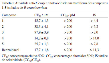 RESULTADOS E DISCUSSÃO O potencial anti-T. cruzi do extrato hexânico das folhas de P. crassinervium foi avaliado in vitro frente as formas tripomastigotas. Quanto testado a 200 μg mL-1, foi observada eliminação de 100% dos parasitas, indicativo de elevado potencial. O fracionamento cromatográfico biomonitorado desse extrato forneceu dois ésteres (1 e 2), uma amida (3) e duas imidas (4 e 5), como mostrado na Figura 1. O composto 5 é inédito e, com exceção de 3, todas as demais substâncias estão sendo descritas pela primeira vez em P. crassinervium.