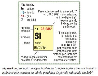 Tabela de parede A legenda referente às informações sobre os elementos químicos que consta na versão 2024 da tabela periódica de parede é reproduzida na Figura 4. Comparando-se esta figura com a Figura 2a, referente a informações similares que constam na versão 2023 da tabela periódica A4, vê-se que a única diferença é a inexistência, na tabela periódica de parede, de valores dos estados de oxidação mais comuns nos compostos. Além disso, na versão 2024 da tabela periódica de parede, para aqueles elementos radioativos que carecem de isótopos com uma distribuição isotópica característica em amostras terrestres, optou-se por não listar nenhuma informação (na versão 2023 da tabela periódica A4, consta a massa atômica relativa do isótopo mais estável). Essa é uma questão que necessitava de padronização, sendo que isso foi feito nas versões 2025 das tabelas, como será descrito mais adiante.