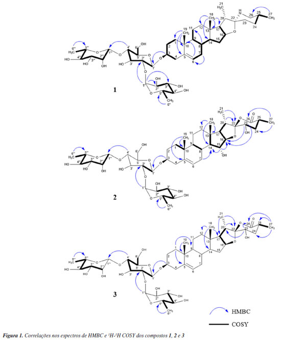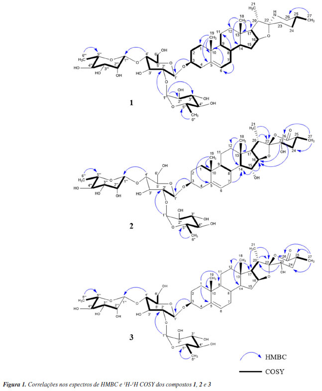 O composto 2 foi obtido como um sólido incolor, [a]D21 -86,557 (c 0,1, CH3OH). A EMAR mostrou um íon molecular protonado com m/z 915,4584 [M + H]+ (calcd. para 915,4466, Δ = 1,8 ppm) e sua fórmula molecular determinada como C45H70O19. O espectro de IV (ATR-FTIR) mostrou duas bandas de absorção em 1757 cm-1 e uma banda intensa em 3392 cm-1 referentes a presença de C=O (éster) e grupos OH, respectivamente. Os sinais no espectro de RMN de 1H e 13C mostraram que a estrutura do composto 2 é formada por uma aglicona e um trisscarídeo ligado em C-3, similar quando comparado aos dados do composto 1. Entretanto, a estrutura da aglicona 2 apresentou deslocamentos semelhantes a aglicona de foliumin.21 Assim como em foliumin, no espectro de RMN de 13C o composto isolado demonstrou a presença de uma insaturação devido aos sinais referentes aos carbonos olefínicos δC 123,12 (C-6) e 141,13 (C-5), e a observação de um hidrogênio olefínico δH 5,36 (H-6) no espectro de RMN de 1H. A estrutura da aglicona foi confirmada por correlações chave nos espectros de RMN de 1H-1H COSY e HMBC (Figura 1). Diferente de foliumin, que é um Δ5-espirosteno dissubstituído, onde só foram observados dois sinais relativos a carbonos anoméricos, aqui temos três sinais relativos a carbonos anoméricos, δC 100,42 (C-1'), 103,01 (C-1''), 102,03 (C-1''') indicando que o composto é Δ5-espirosteno substituído com um trissacarídeo. Esqueletos espirostenos são comuns em espécies de Solanum e muitas dessas estruturas, glicosiladas na posição C-3 já foram isoladas.22 A posição da dupla ligação foi confirmada por correlações no espectro de HMBC de δH 1,05 (H-19) / δC 141,13 (C-5), δH 1,05 (H-19) / δC 37,93 (C-10), além da comparação com dados da literatura. Já a conectividade dos açúcares foi confirmada pelas correlações no espectro de HMBC δH 4,49 (H-1') / δC 79,31 (C-3), δH 4,84 (H-1'') / δC 80,01 (C-2') e δH 5,20 (H-1''') / δC 79,27 (C-4'). O espectro de RMN de 1H também exibiu quatro sinais relativos a duas metilas singletos δH 1,05 (3H, s), 0,83 (3H, s) e duas metilas dubletos 1,19 (3H, d), 1,01 (3H, d) assim como em solamargina,23 condizentes com a biossíntese dessas estruturas. A principal diferença entre 1 e 2 está no carbono não oxigenado δC 110,54 (C-22) que nesta estrutura não mais está ligado a um nitrogênio e a um oxigênio e sim a dois oxigênios, deixando de ser então um alcaloide esteroidal e passando a ser uma saponina esteroidal. Também foi possível observar no espectro de RMN de 13C a presença de um outro carbono não oxigenado conectado a um grupo carbonila δC 183,24 (C-26), e duas hidroxilas, evidentes pelos sinais de dois carbonos ligados a oxigênio, 78,68 (C-23) e 80,46 (C-15), além dos dois hidrogênios hidroximetínicos δH 3,82 (H-15, 1H, m) e 4,38 (H-23, 1H, dd) no espectro de RMN de 1H. A posição desses grupos foi confirmada pelas correlações no espectro de HMBC δH 1,19 (H-27) / δC 183,24 (C-26), δH 1,01 (H-21) / δC 110,54 (C-22), δH 4,38 (H-23) / δC 91,64 (C-16) e δH 3,82 (H-15) / δC 91,64 (C-16). O trissacarídeo ligado na posição C-3 da aglicona também apresentou deslocamentos referentes a duas L-ramnose e uma D-glicose, assim como em solamargina.23 Todos os dados obtidos foram condizentes para identificação dessa estrutura como (22S,23R,25R)-3β,15α,23-tri-hidroxispirosina-5-en-26-ona 3-O-{α-L-ramnopiranosil-(1→2)-[α-L-ramnopiranosil-(1→4)]-β-D-glicopiranosídeo} ou foliumin A.24 Apenas um registro desse composto foi encontrado na literatura podendo este então ser considerado raro, entretanto, não foi possível encontrar dados do seu completo assinalamento, disponíveis agora neste trabalho. Dados de RMN de 1H e 13C foram apresentados na Tabela 1 e no Material Suplementar (Figuras 10S-18S). O composto 3, um sólido incolor, [a]D21 -113,414 (c 0.1, CH3OH), teve sua fórmula molecular determinada como C45H70NaO18 por EMAR, com m/z 921,4479 [M + Na]+ (calcd. para 921,4422, Δ = 2,6 ppm). O espectro de IV (ATR-FTIR) mostrou uma banda de absorção em 1757 e 3371 cm-1 relativas à presença de C=O (éster) e grupos OH, respectivamente. O espectro de RMN de 1H exibiu três sinais relativos a hidrogênios anoméricos de açúcares δH 5,20 (1H, d), 4,84 (1H, d), 4,49 (1H, d), duas metilas singletos 1,04 (3H, s), 0,81 (3H, s) e duas metilas dubletos 1,19 (3H, d), 1,02 (3H, d). No espectro de RMN de 13C, sinais relativos de C-1 a C-13 e C-19 a C-27 mostraram deslocamentos químicos similares a estrutura de 2, mas sinais relativos a δC 32,68 (C-15), 83,15 (C-16) e 63,40 (C-17) foram similares a solamargina23 sugerindo que a aglicona de 3 é um derivado 15-desidroxilado de 2. Entretanto, sinais relativos ao trisscarídeo no espectro de RMN de 13C do composto 3 foram iguais a solamargina e ao composto 2, uma 3-O-β-chacotriose. A estrutura da aglicona e seus trissacarídeos foram confirmadas por correlações chave nos espectros de RMN de 1H-1H COSY e HMBC (Figura 1). Após uma ampla revisão da literatura não foi encontrado nenhum relato do isolamento desse composto anteriormente, sendo um novo Δ5-espirosteno, substituído com um trissacarídeo, identificado como (22S,23R,25R)-3β,23-diidroxiespirost-5-en-26-ona 3-O-{α-L-ramnopiranosil-(1→2)-[α-L-ramnopiranosil-(1→4)]-β-D-glicopiranosídeo}. Dados de RMN de 1H e 13C também estão dispostos na Tabela 1 e os espectros no Material Suplementar (Figuras 19S-27S).
