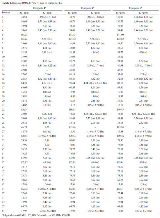 RESULTADOS E DISCUSSÃO Do extrato hidroalcoólico das partes aéreas de S. jabrense foram isolados três glicosídeos esteroidais, compostos 1, 2 e 3 (Figura 1). As estruturas foram elucidadas com base na análise de dados de infravermelho (IV), rotação óptica (RO), ressonância magnética nuclear (RMN) e espectrometria de massas de alta resolução (EMAR), além da comparação com dados disponíveis na literatura.