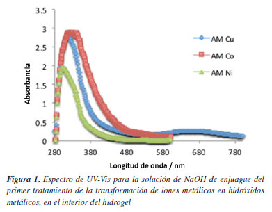 Se analizaron las soluciones residuales mediante UV-Vis y en todos los casos las soluciones residuales contenían concentraciones similares a la solución madre correspondiente. Con lo cual se puede establecer que el proceso de hinchamiento y secado de las muestras, permite una mayor carga de metal dentro de la matriz polimérica. En la Figura 1 se observa que las curvas obtenidas en el análisis del espectro de UV-Vis para la primera solución residual de NaOH de los hidrogeles de acrilamida estudiados, para cada metal cargado alrededor de 300 nm, que se presenta una fuerte señal en el espectro mostrado. Cuando se sintetizan partículas metálicas, una forma de identificar la presencia de estas partículas es mediante la aparición de esta señal.9 De estas curvas se puede obtener la banda prohibida, así como los eV de las partículas metálicas. En tanto que el tamaño y la forma de la partícula se obtiene mediante el microscopio electrónico. Por lo que la aparición de estas curvas en la solución NaOH del primer tratamiento, nos permite establecer que el metal adherido a la superficie del hidrogel o en la cercanía de la superficie, sufre una transformación hacia el hidróxido y su posterior migración a la solución. En tanto que el metal que penetro en el hidrogel, sufre la transformación dentro de él.