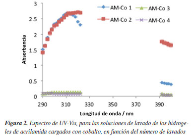 En la Figura 2 se presentan los espectros de UV-Vis, para las soluciones de lavado de los hidrogeles de acrilamida cargados con cobalto, donde se observa que la señal alrededor de 300 nm, va disminuyendo al aumentar el numero de lavado hasta casi desaparecer en el tercer y cuarto lavado. Con esto, podemos establecer que las partículas del metal que se han formado en el interior del hidrogel, ya no han emigrado a la solución. Resultados semejantes se obtuvieron para el resto de los hidrogeles.
