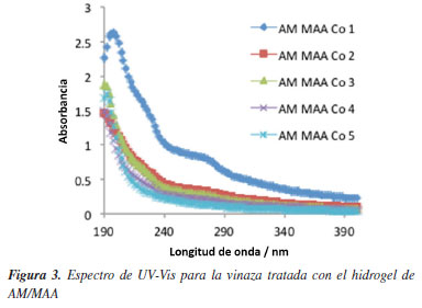 Experimentos de la clarificación de la vinaza Los hidrogeles cargados con el metal e hinchados en solución NaOH 0.1 M, se pusieron en contacto con la vinaza en una proporción 1:1 en masa. Se tomaron muestras a las 24, 48, 72 h y a los 7 días. Se realizo una dilución a todas las muestras recolectadas con agua destilada, para obtener una concentración de 1.2% y de esta forma poder realizar la comparación entre las soluciones de vinazas tratadas con la solución madre original. Cuando se analizaron los espectros de UV-Vis a los tiempos estudiados, se observa que, a las 48 h, se alcanzan los valores mínimos en la intensidad de las curvas, por lo que el proceso de absorción de los compuestos orgánicos por el hidrogel llegaba al punto de equilibrio, por lo que se estableció que el tiempo de experimentación de todas las muestras sería de 2 días. En la Figura 3 se presentan los espectros de UV-Vis para las diferentes etapas de tratamiento de la vinaza con el hidrogel de AA/MAA cargado con cobalto, los cuales se comparan con el espectro que tiene la composición de 1.22% de vinaza (que es la composición de todas las muestras diluidas que se tomaron después de cada tratamiento de la vinaza), donde se observa la disminución en la intensidad del espectro de las muestras tratadas. La disminución en la intensidad de los espectros se correlaciona de forma visual al cambio en la intensidad de la coloración de la vinaza tratada, que se presenta en la Figura 4. En esta figura se presentan las fotografías de las vinazas después de cada tratamiento realizado, donde se observa la disminución en la intensidad de la coloración, desde un café intenso hasta un amarillo descolorido.
