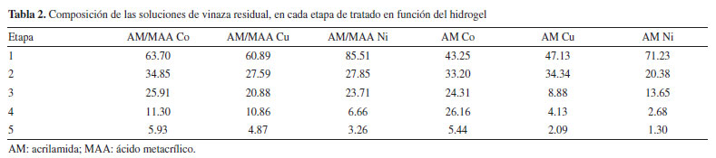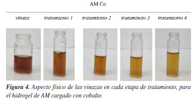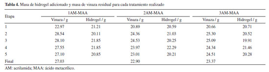 Al colocar la vinaza en contacto con los hidrogeles, no se observo un cambio significativo en el volumen de la vinaza tratada, con lo que se puede establecer que la clarificación de las vinazas es debido a la absorción por parte de los hidrogeles, de los compuestos que les proporcionan color a las vinazas y no por la dilución de la vinaza con la solución que contienen los hidrogeles. Esto se observa en la Tabla 4, donde se presentan las masas residuales de las soluciones de vinaza y de los hidrogeles en cada etapa de tratamiento y existe un ligero incremento en el volumen de la vinaza tratada, solo en la etapa 1, manteniéndose constante en el resto de las etapas. Esto se observa para todas las muestras de hidrogeles utilizados.