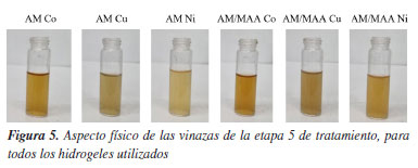 La composcion calculada mediante la ecuación obtenida con el análisis de UV-Vis, (Tabla 2) se observa la disminución de la concentración de las vinazas tratadas y se puede apreciar que los hidrogeles que contienen níquel tienen una mejor eficiencia, pudiéndose apreciar también de forma visual en la Figura 5, donde se presentan las vinazas tratadas en la etapa 5. Se obsrva que la tonalidad de las vinazas tratadas con los hidrogeles que dontienen níquel, presentan un color amarillo menos intenso, con respecto al resto de las muestras y se corrobora en la Tabla 2. Mientras que la concentración de las soluciones residuales de las vinazas al utilizar níquel alcanzó el valor de 1.30% con el hidrogle da AM, las concentraciones de las soluciones residulaes fueron de 2.09 y 5.44% para los hidroglees de Cu y Co respectivamente. Cuando se compara el tipo de hidrogel utilizado, se observa que los hidrogles de AM disminuyen la concentración de las soluciones residuales con mayor eficiencia que cuando se compara con el hidrogel de AM/MAA, cuando se utiliza níquel.