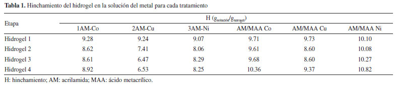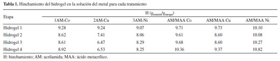 RESULTADOS Y DISCUSIONES Carga y reacción del metal La capacidad de absorber agua o solución del hidrogel, es conocida como hinchamiento (H), el cual se mide por los gramos de solución absorbida por cada gramo de xerogel, en la Tabla 1 se presenta el hinchamiento obtenido por cada tipo de hidrogel con el metal correspondiente por cada tratamiento realizado. Se observa que el hinchamiento disminuye gradualmente en cada etapa realizada para los hidrogeles de AM, mientras que para los hidrogeles de AM/MAA, el hinchamiento se mantiene constante.