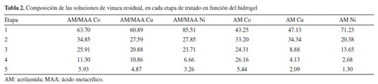 PARTE EXPERIMENTAL Métodos y materiales Los monómeros a utilizados fueron acrilamida (AM) y ácido metacrílico (MAA), con una pureza del 99% obtenidos de Sigma. Las sales de cloruro de cobalto (CoCl2.6H2O), cloruro de cobre (CuCl2.2H2O) y cloruro de níquel (NiCl2.6H2O) fueron obtenidos de Sigma con 99% de pureza. El iniciador de la reacción de polimerización persulfato de potasio (KPS) con 99% de pureza fue obtenido de Aldrich. El agente entrecruzante N',N'-metilenebisacrilamida (NMBA) con 99% de pureza fue obtenido de TCI. El agua bidestilada y deionizada para todos los experimentos fue obtenida de productos Selecropura. Se utilizó el espectrofotómetro Unico s-250 con celdas de cuarzo. Síntesis de hidrogeles En trabajos previos17-22 se han sintetizado y estudiado ampliamente hidrogeles de acrilamida y acrilatos. Por lo que se siguió el procedimiento de dichos estúdios para este trabajo; preparar hidrogeles de acrilamida y acrilamida/ácido metacrílico (90:10), en soluciones al 10% de monómeros totales (en masa), con 1% de agente entrecruzante y 3% de iniciador, llevándose la reacción a 55 ºC durante 2 h. Una vez sintetizados los hidrogeles se cortaron en cilindros de 1 cm de espesor, se colocaron en agua destilada por una semana, al final de este tiempo se colocaron a secar en una estufa de vació hasta peso constante, al polímero seco se le conoce como xerogel. Carga del metal Se colocaron los xerogeles de acrilamida y acrilamida/ácido metacrílico en soluciones de cloruro de cobre (3000 ppm), cloruro de cobalto (2000 ppm) y cloruro de níquel (1975 ppm), en una proporción de solución metálica/xerogel de 40:1 en masa por un tiempo de dos días. Al termino de este tiempo los hidrogeles, son retirados del medio y se colocan a secar, en una estufa de vació a 50 ºC, una vez que las muestras están totalmente secas, se reincorporan en la solución del metal, esta nueva solución esta constituida de la solución residual y se completa con solución fresca de los iones metálicos correspondientes, hasta completar una proporción de solución/hidrogel de 40:1. Se repite el proceso anterior por 4 ocasiones mas. Este proceso se realiza para provocar que los iones metálicos penetren lo mas posible en la matriz polimérica. Transformación del metal en hidróxidos y limpieza de los hidrogeles Una vez terminado el proceso de carga del metal, los hidrogeles conteniendo los iones metálicos e hinchados del ultimo proceso de carga, se sumergieron en soluciones acuosas de NaOH 0.1 M, en una proporción de solución de NaOH/hidrogel de 5:1, con la finalidad de que los iones OH-, penetren al hidrogel y en el interior del mismo se lleve a cabo la reacción con el metal correspondiente. Los hidrogeles permanecen sumergidos en estas soluciones metálicas por un tiempo de dos días. Los hidrogeles son removidos del medio, y se colocan en solución fresca de NaOH 0.1 M, por dos días mas. La solución residual de NaOH es analizada mediante espectroscopia ultravioleta-visible (UV-Vis), para determinar la presencia de iones metálicos o partículas de estos metales. El procedimiento anterior se repite hasta que no se detecte por medio del UV-Vis la presencia de partículas, en la solucion residual, con lo que se establece que los compuestos metálicos formados permanecen en el interior del hidrogel. Hinchamiento en la ¨vinazas¨ Los hidrogeles cargados y almacenados en solución de NaOH, son colocados en la solución madre de vinaza en una proporción de 1:1 en masa (esto equivale a 1 g de vinaza por cada 0.02 g de polímero seco) sin agitación durante dos días. Al termino de este tiempo son removidos del medio. La solución residual resultante es analizada por espectrometría de UV-Vis. A la solución de vinaza residual se le agrego un nuevo hidrogel y se repitió el procedimiento anterior. En total fueron agregados en 5 ocasiones hidrogeles para cada muestra de vinaza estudiada. Curva de calibración La vinaza fue obtenida de la fermentación de "raicilla" de la compañía de Raicilla Hermanos Arrizón, Rancho La Vieja, Mexico, el único tratamiento que se le dio a la vinaza, fue un proceso de filtración en una rejilla de 0.5 µm de longitud. La solución madre (vinaza obtenida) fue utilizada para preparar diluciones de la misma mediante agua destilada para la preparación de la curva de calibración y realizar la medición de absorbancia mediante espectrometría de UV-Vis en una longitud de onda de 250 nm. El análisis se realizo en celdas de cuarzo, con el espectrofotómetro UV-Vis marca UNICO modelo 250. Se eligió la longitud de onda de 270 nm, ya que en los espectros obtenidos en este punto se presentaba una curva característica que iba disminuyendo de forma gradual con la dilución de la vinaza. La ecuación de la curva de calibración fue [vinaza] = 1.7809 × Abs - 0.1419, la cual tiene un coeficiente de correlación de 0.99, y fue utilizada al medir la absorbancia de diferentes concentraciones de vinazas preparadas y, de esta forma, calcular la concetración con dicha ecuación, obteniendose mediciones con una desviación estandar menor al 3%. Las muestras recolectadas de cada prueba, para su evaluación, fueron diluidas de tal forma que la concetración de la vinaza tenga un valor cercano al 5%, despues del tratamiento, ya que esta concentración se encuentra en un punto medio de la curva de calibración, donde la relación de la absorbancia vs. concentración tiene comportamiento lineal.
