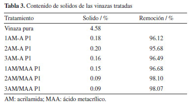 En la Tabla 3 se presenta la determinación de los solidos totales de las vinazas tratadas después de la etapa 5, donde se observa que se ha removido alrededor del 98% de los solidos totales para todas las muestras.